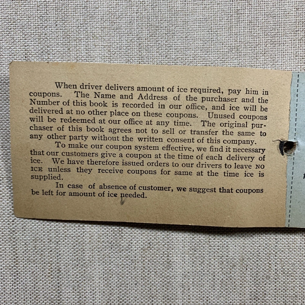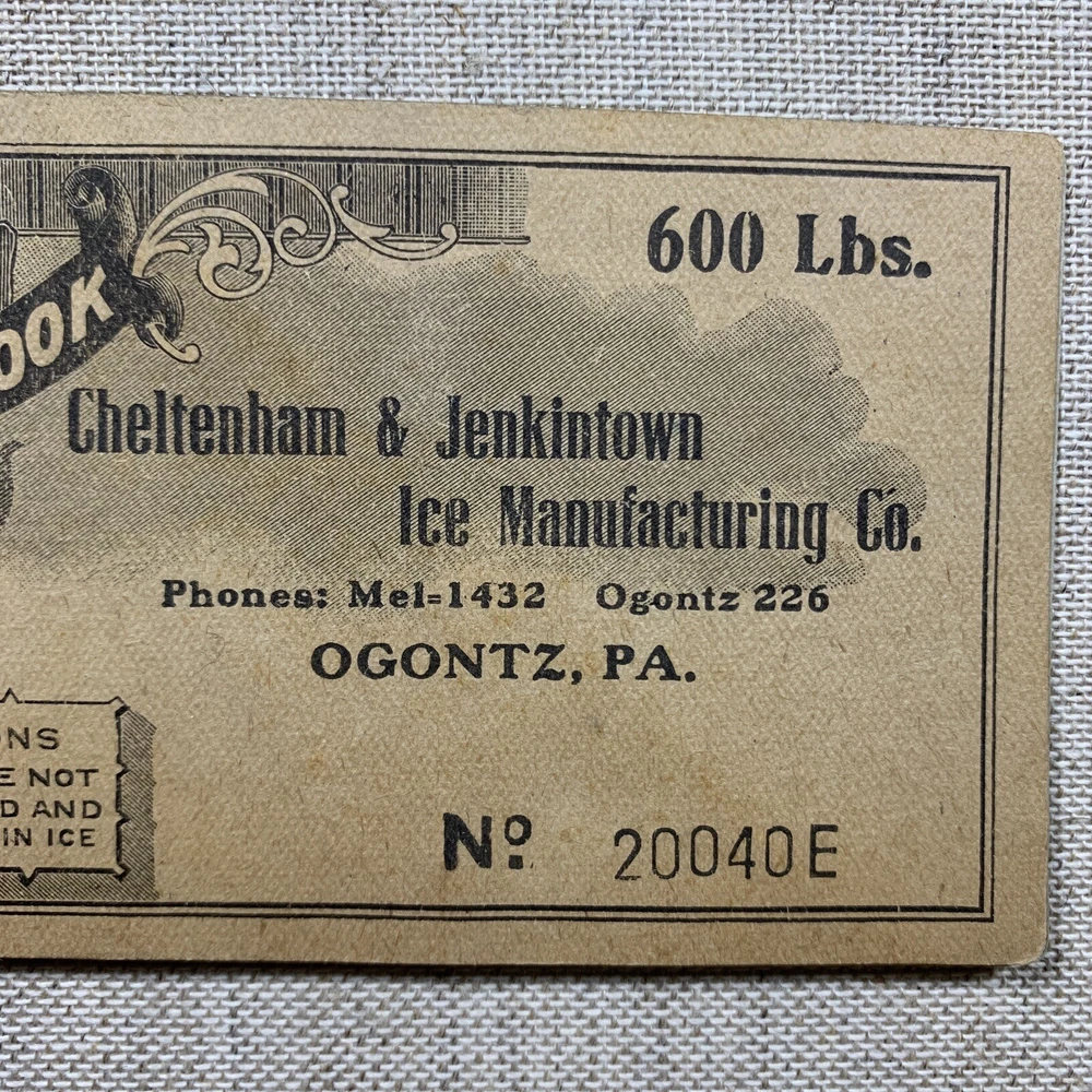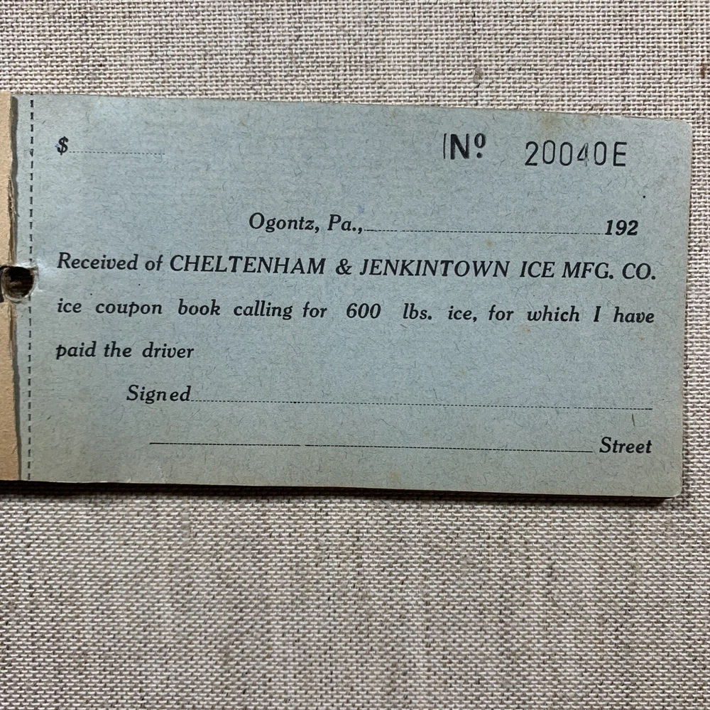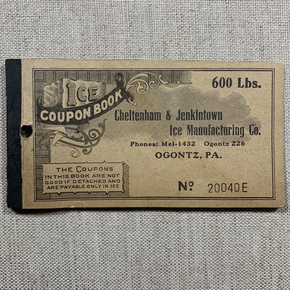 Vintage Cheltenham & Jenkintown Ice Manufacturing Co Coupon Book 1920’s. Ogontz, Montgomery County, PA. Empty Coupon book for 600 lbs of ice. The only date found in the booklet is “192_”. The cover is partially loose, and all of the coupons have been used.