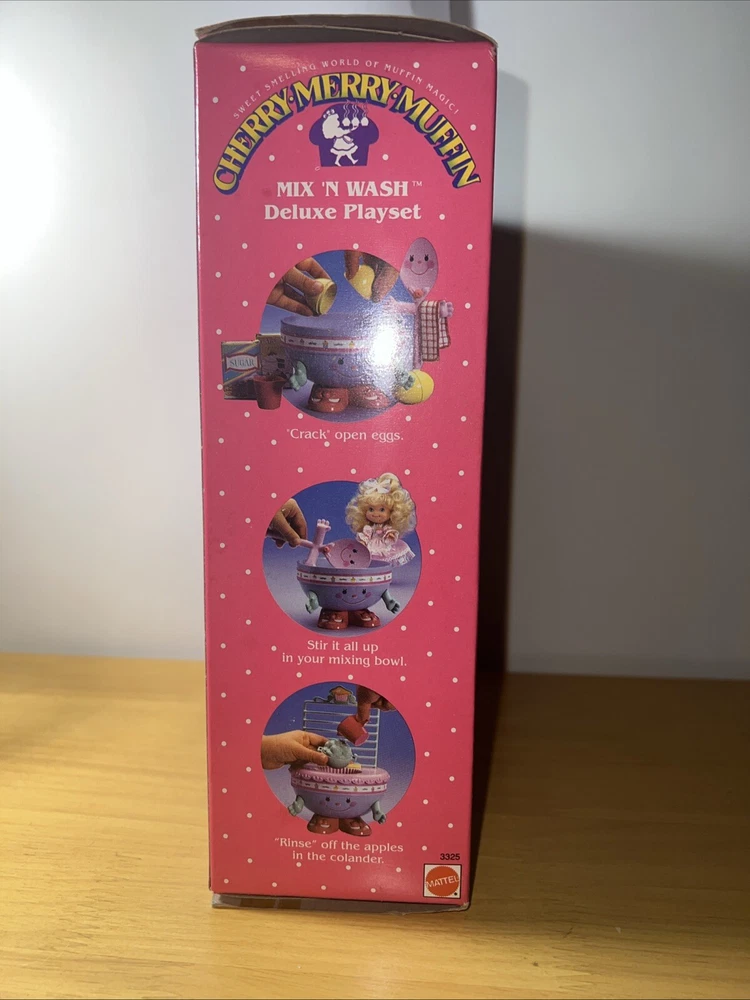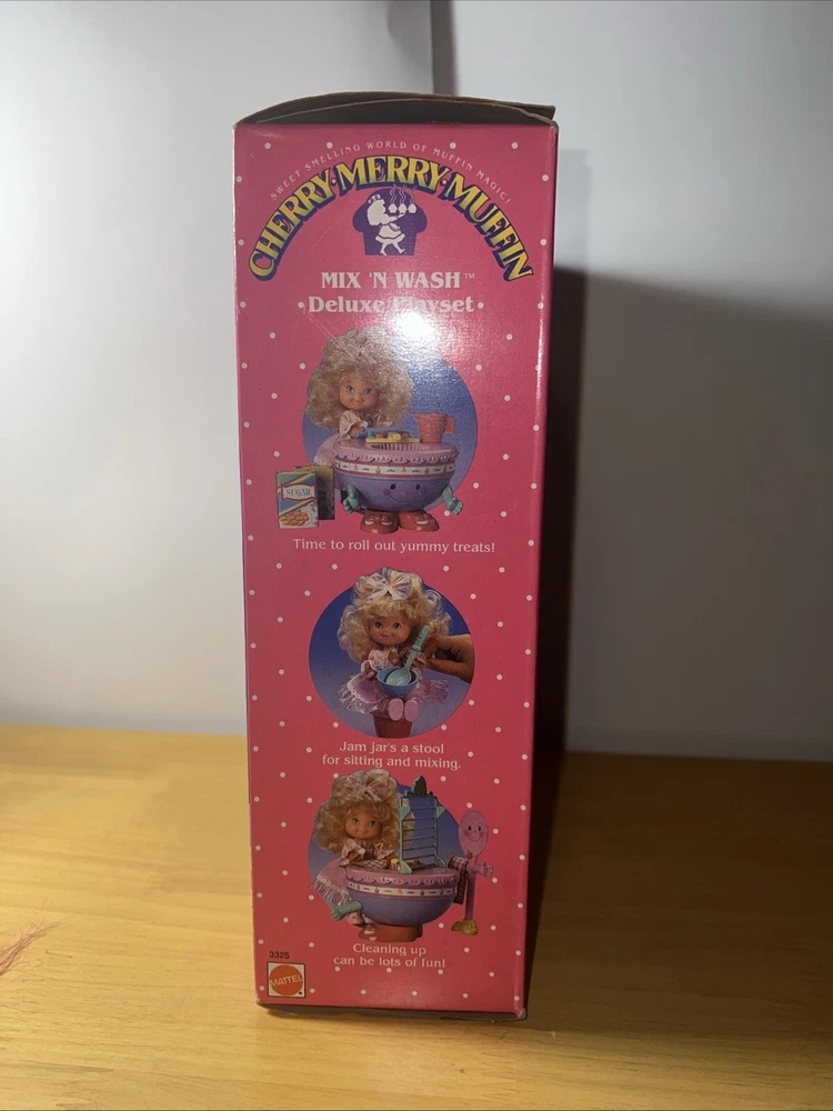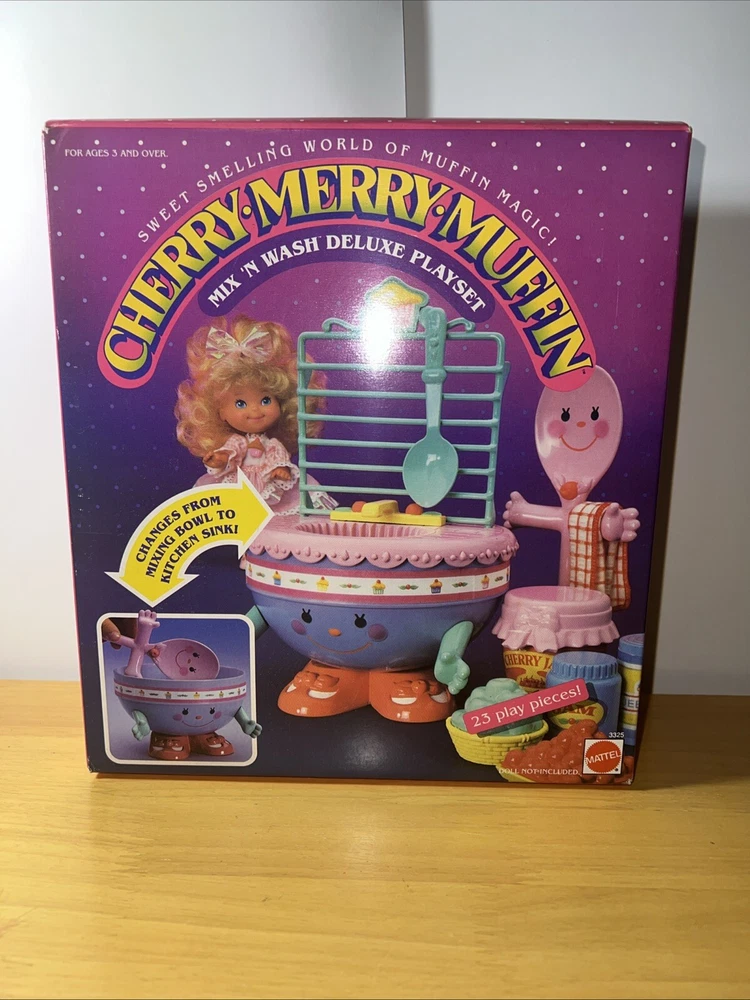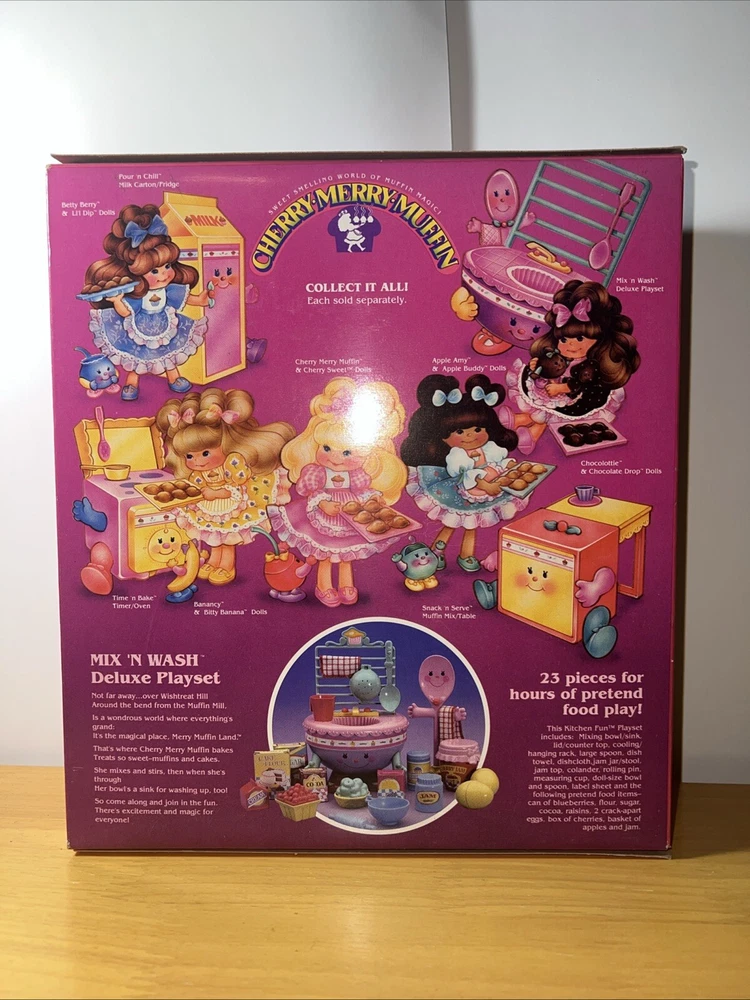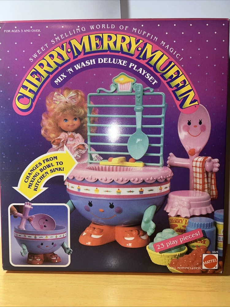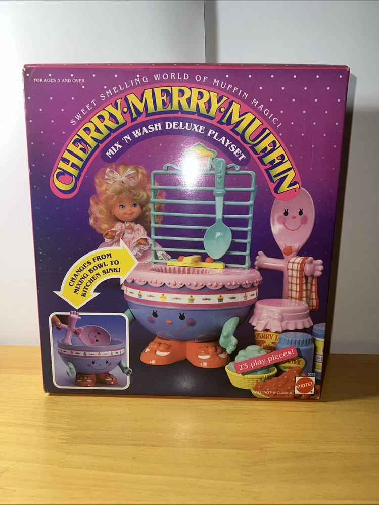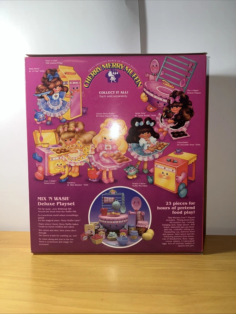 This is a complete and original boxed playset of the Vintage Cherry Merry Muffin Mix and Wash Deluxe from Mattel. The set includes everything you need to make your own delicious muffins, and is perfect for children aged 3-11 years old. The playset is made of durable plastic and was manufactured in Thailand in 1988. It is part of the Cherry Merry Muffin character family and is a great addition to any vintage toy collection.