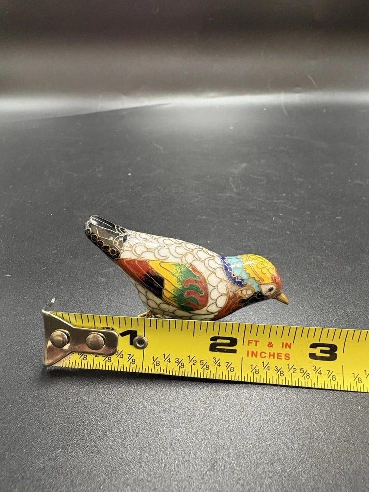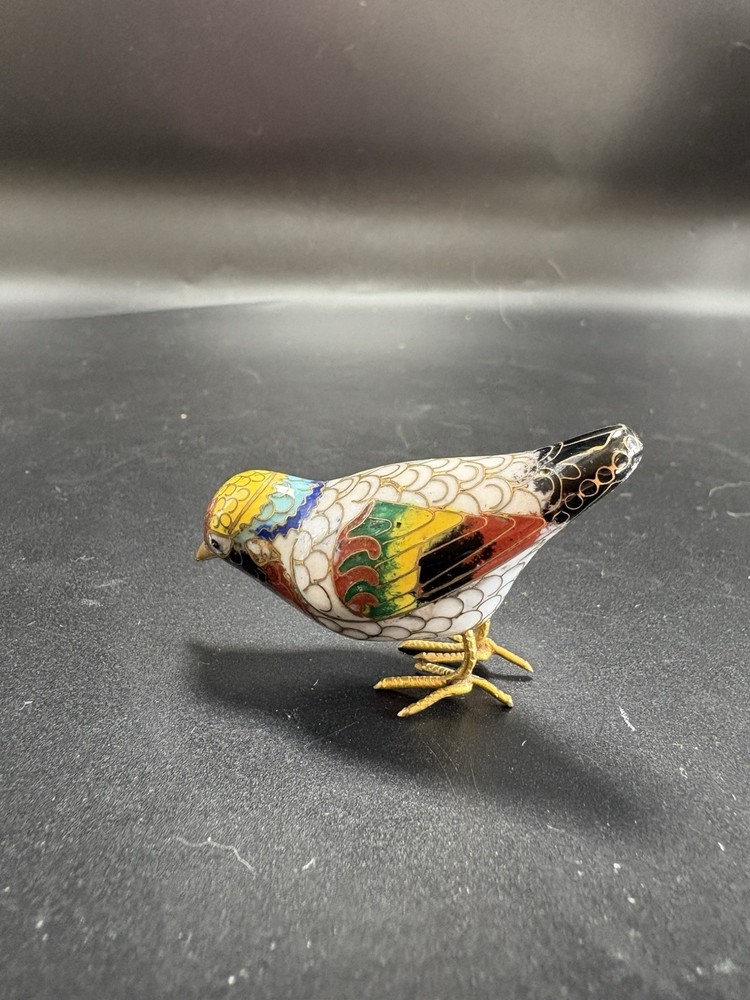 This vintage Chinese cloisonné enamel miniature bird figurine stands at 2 inches tall and 3 inches long. Made from brass with multicolor enamel, this original piece showcases intricate marquetry details. Handcrafted in China post-1940, this figurine captures the essence of traditional Chinese craftsmanship and design, making it a unique and timeless addition to any collection. All items are sold as is. We do our best to photograph any imperfections and list marks, scratches, or any other damage in the description. If you have any questions regarding an items condition please feel free to send us a message.
