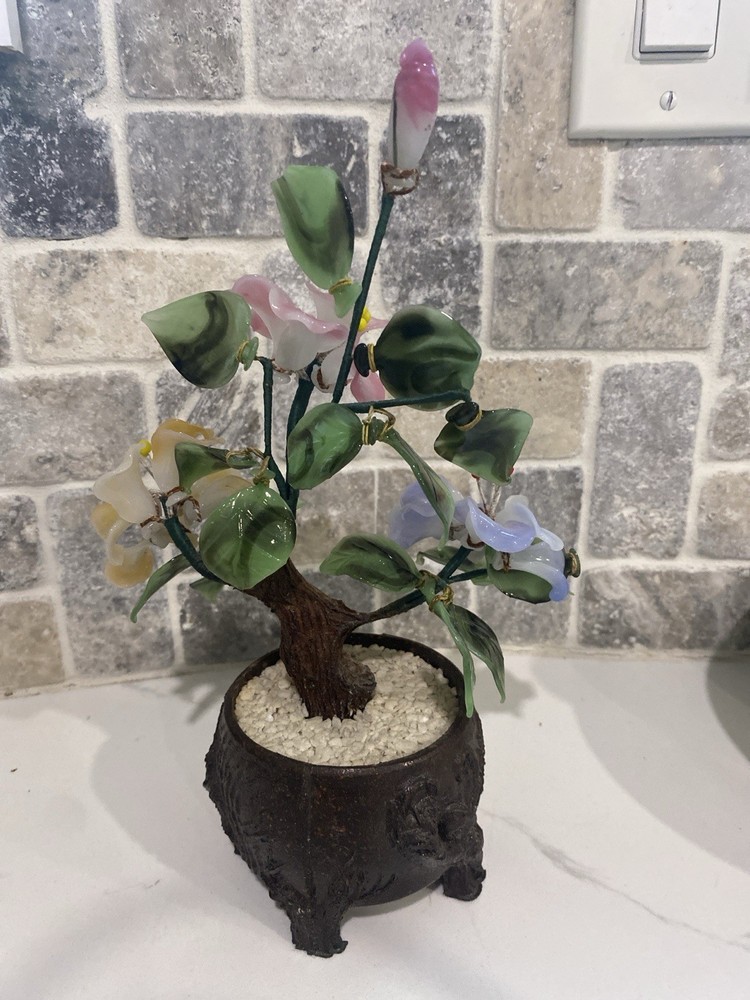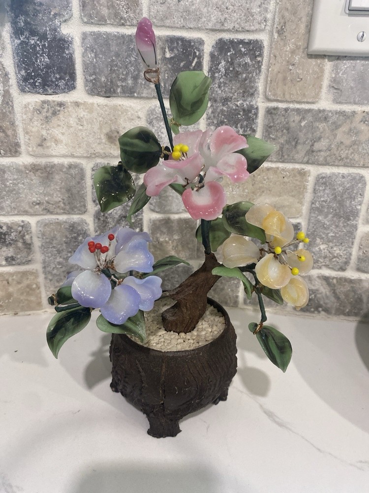 $ 66.0Large Chinese Jade Quartz Stone Glass Flower Bonsai Tree Vintage