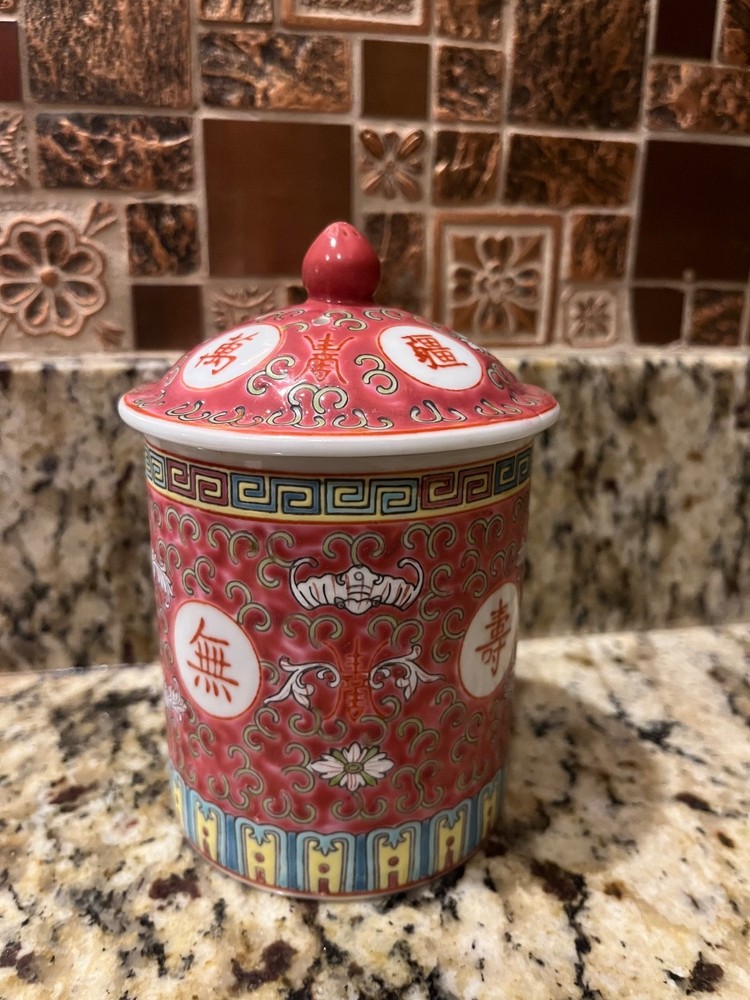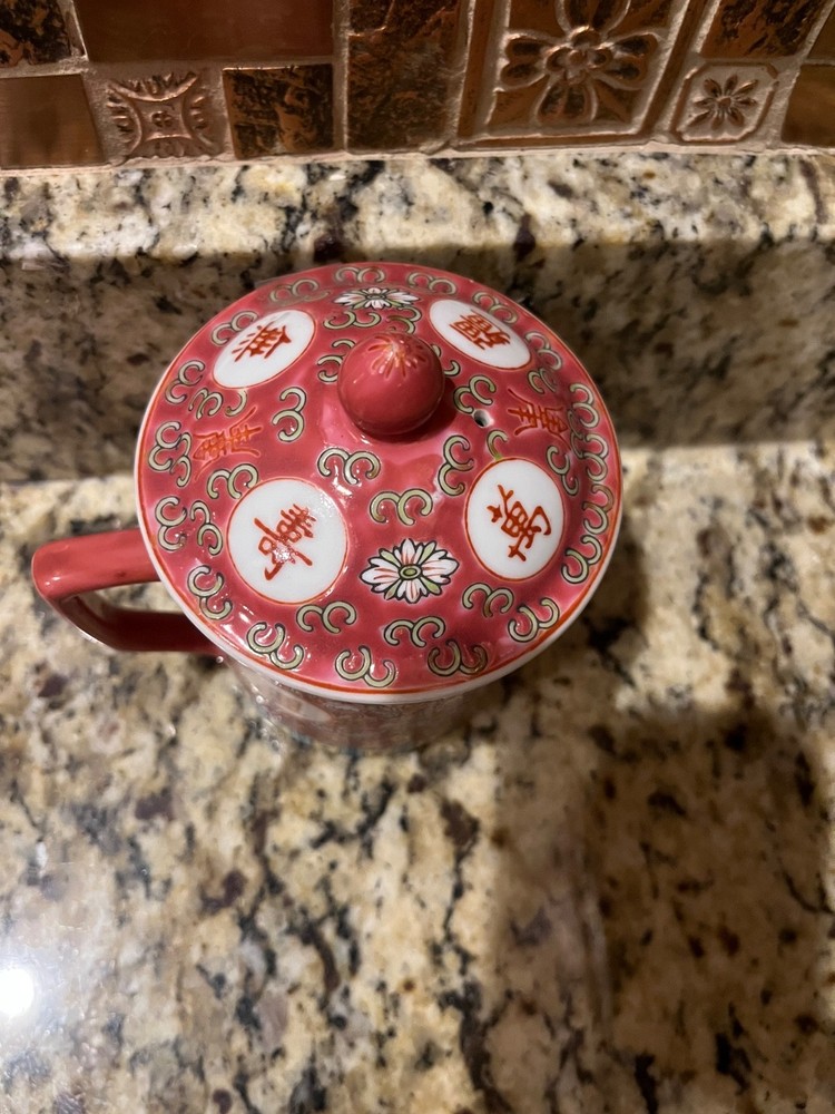 Adorn your tea time with this exquisite vintage Chinese mug and lid set. The vibrant coral red glaze serves as a stunning canvas for intricate golden and floral motifs, each element whispering tales of tradition. Imagine the comforting warmth of your favorite brew held within this beautifully crafted vessel, the delicate patterns catching the light as you sip. The secure-fitting lid promises to keep your beverage warm, allowing for moments of tranquil reflection or engaging conversation. Perfect for a serene morning ritual, an afternoon tea party, or as a unique decorative piece for your home. Type: Tea Mug Set Includes: Mug, Cup Lid Theme: Letters, Numbers & Words Pattern: Floral Material: Ceramic Occasion: Chinese New Year, All Occasions Features: With Lid, Suitable for Hot Beverages Shape: Round Style: Traditional Item Width: 3 in Number of Items in Set: Two-Piece Unit Type: Unit Keywords: tea cup, coffee mug, lidded mug, oriental decor, asian art, collectible, gift, home decor, kitchenware, traditional, ceramic, floral design, gilded, chinesestyle