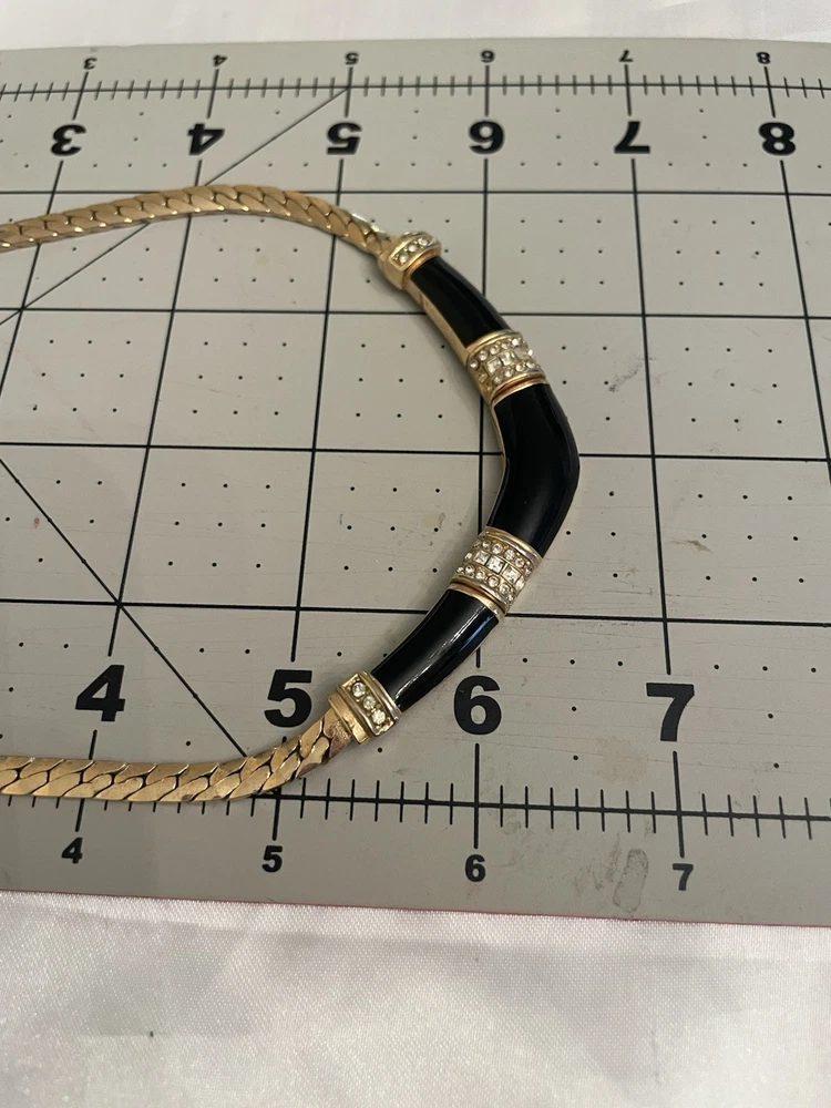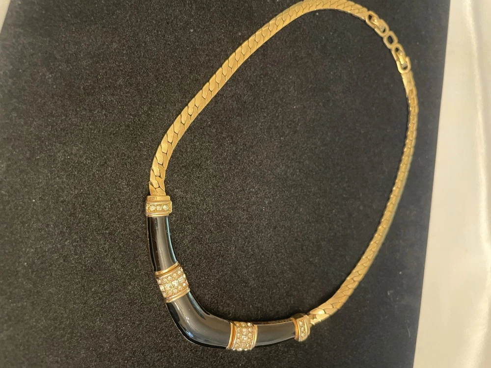 VTG CHRISTIAN DIOR BLACK ENAMEL CLEAR RHINESTONES GOLD TONE FLAT LINK CHAIN Shows Some Wear Back Side Of Enamel Design, Minor Wear Chain & Clasp, Consistent With Age. SEE ALL PICTURES
