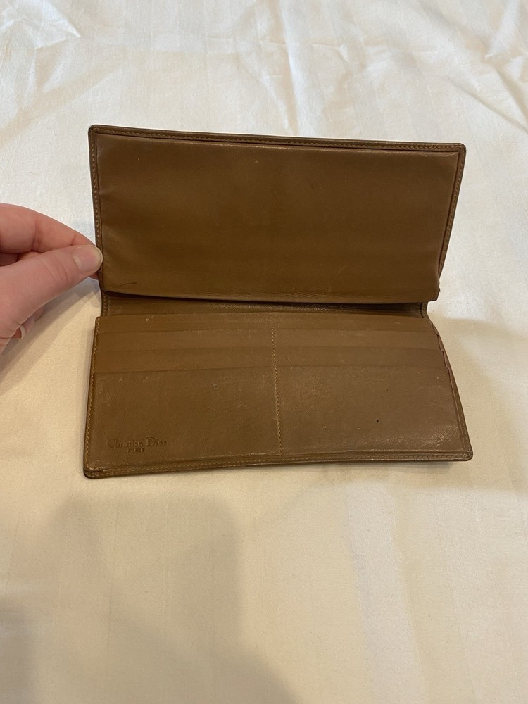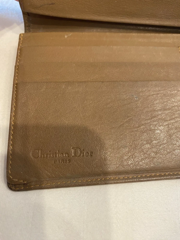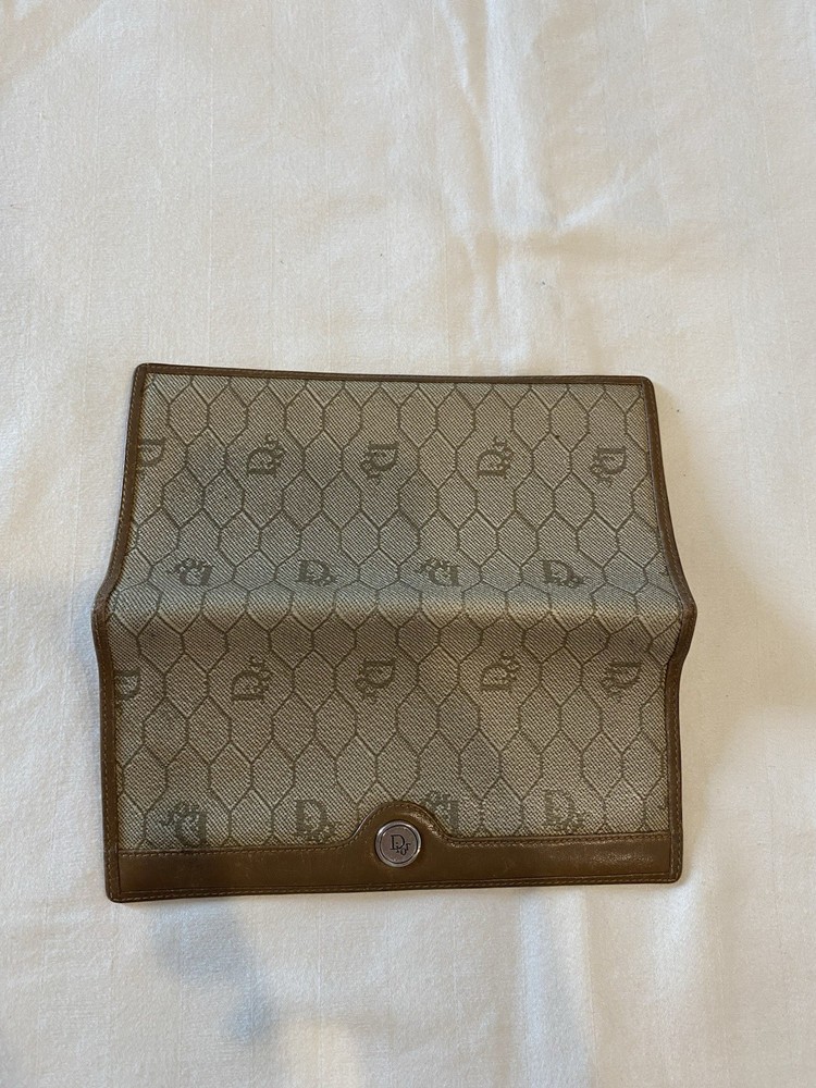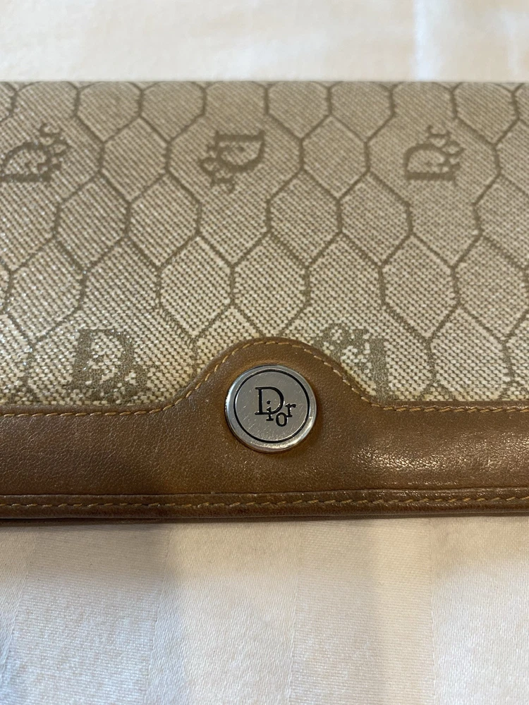 This Christian Dior Vintage Honeycomb PVC & Leather Bifold Long Wallet is a stylish and elegant accessory for women. Made with a combination of canvas and leather materials in beige and tan colors, this wallet features the iconic monogram logo of Christian Dior. The vintage design adds a touch of sophistication, with the honeycomb theme adding a unique and intricate detail to the overall look. With its folding style and convenient size of 3 1/2" in length and 7 1/4" in width, this wallet is both practical and fashionable, making it a perfect addition to any fashion-forward woman's collection. Preowned- good/fair condition. Slight signs of wear on outside and inside of wallet as seen in pictures. Slight rip on the seam of the checkbook side of the wallet pictured. This can easily be fixed at Christian Dior or a local cobbler you trust. Pen mark noted on wallet (as seen). Overall, still really good condition considering this wallet is a vintage piece. Wallet still has yearsss of life left. Get this iconic wallet for an amazing price!!! Comes with entrupy certificate of authenticity.