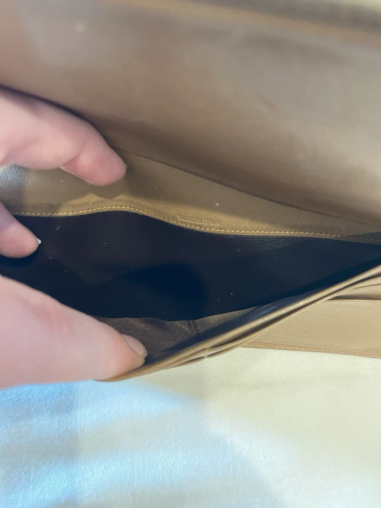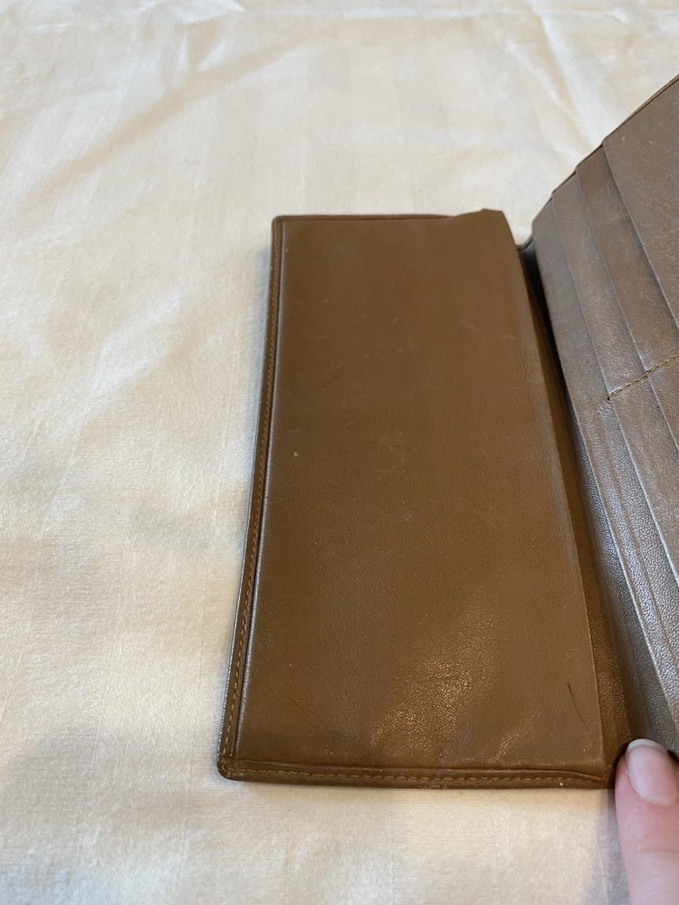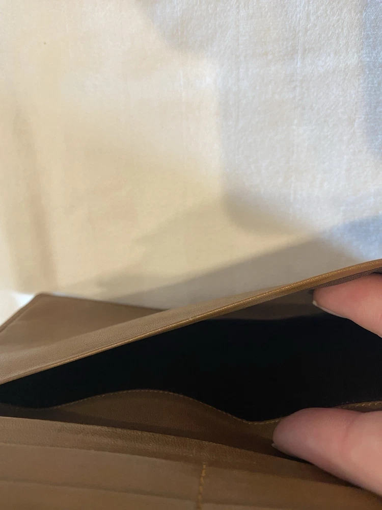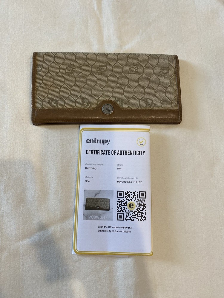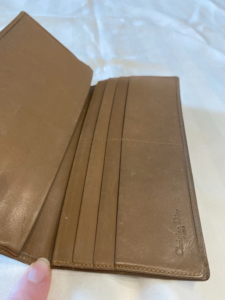 This Christian Dior Vintage Honeycomb PVC & Leather Bifold Long Wallet is a stylish and elegant accessory for women. Made with a combination of canvas and leather materials in beige and tan colors, this wallet features the iconic monogram logo of Christian Dior. The vintage design adds a touch of sophistication, with the honeycomb theme adding a unique and intricate detail to the overall look. With its folding style and convenient size of 3 1/2" in length and 7 1/4" in width, this wallet is both practical and fashionable, making it a perfect addition to any fashion-forward woman's collection. Preowned- good/fair condition. Slight signs of wear on outside and inside of wallet as seen in pictures. Slight rip on the seam of the checkbook side of the wallet pictured. This can easily be fixed at Christian Dior or a local cobbler you trust. Pen mark noted on wallet (as seen). Overall, still really good condition considering this wallet is a vintage piece. Wallet still has yearsss of life left. Get this iconic wallet for an amazing price!!! Comes with entrupy certificate of authenticity.