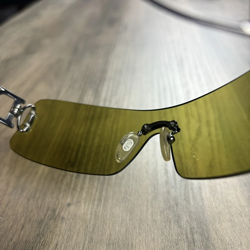 Vintage Christian Dior Miss Diorella Olive Green Shield Rimless Sunglasses Y2K. Condition is Pre-owned. Shipped with USPS Ground Advantage.