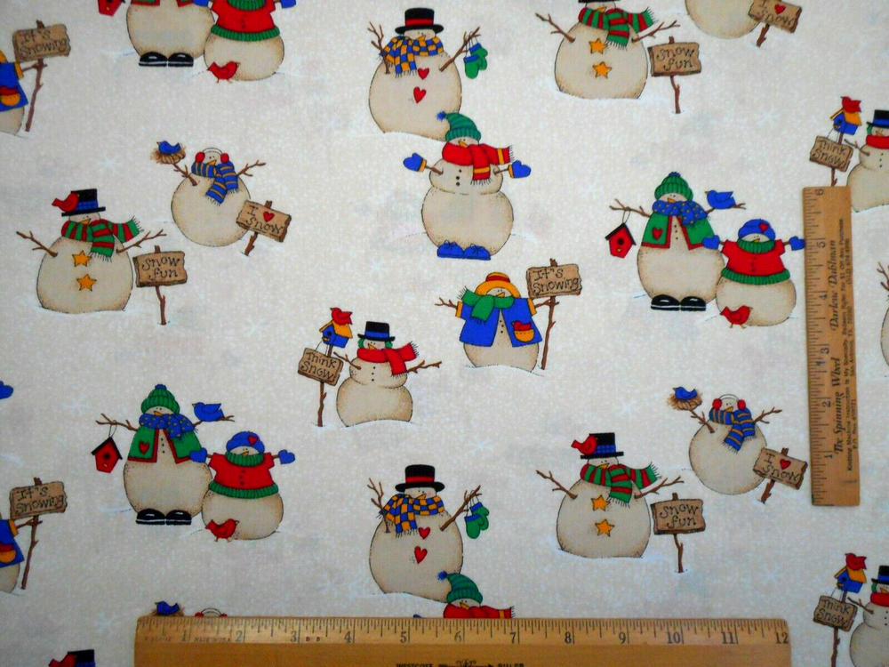 This is a very nice fabric that is 100% cotton. This fabric is out of print. It has snowmen dressed in hats, gloves, mittens & jackets with signs & birds & birdhouses on a cream background with snow dots in it.. READ: Because computer monitors show colors and shades differently, the fabric colors can vary from the photos. If you have any questions regarding this, please contact me before p urchasing the item. I have been a quilter for 30 years and would be happy to answer any questions you might have. This is for 3/4+ Yard if Fabric. This fabric is only 1/2" short of 7/8 Yard. If you have a problem with anything you purchase from me, please contact me before leaving neutral or negative feedback and I will work it out with you. Payment is due within 48 hours. If payment isn't received within 5 days, it will automatically go to Ebay's resolution center for non-payment. INSTRUCTIONS FOR COMBINED SHIPPING: I Do combine shipping. You must add the items to your shopping cart and request an invoice from me using the REQUEST TOTAL BUTTON BEFORE completing the payment process, or I won't be able to combine your shipping. Payment is due upon receipt of your invoice. Thank you for looking and God bless you and your family. IF THERE IS A PROBLEM WITH ANY PURCHASE, PLEASE CONTACT ME, THE SELLER, VIA EBAY'S MESSAGING SYSTEM PRIOR TO OPENING A CASE--OPENING A CASE, EVEN IF RESOLVED SMOOTHLY, CAN HURT THE SELLER'S RATINGS. THANK YOU