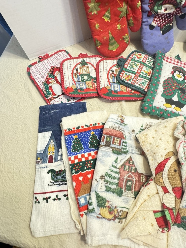 This vintage Christmas linen lot includes 7 kitchen towels and 11 pot holders, totaling 18 pieces adorned with a festive multicolor design. Please feel free to contact me with any questions you have