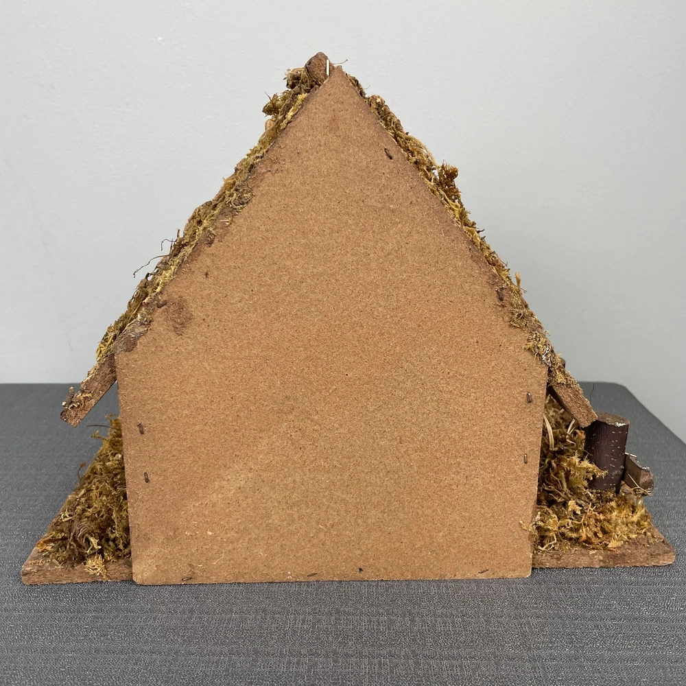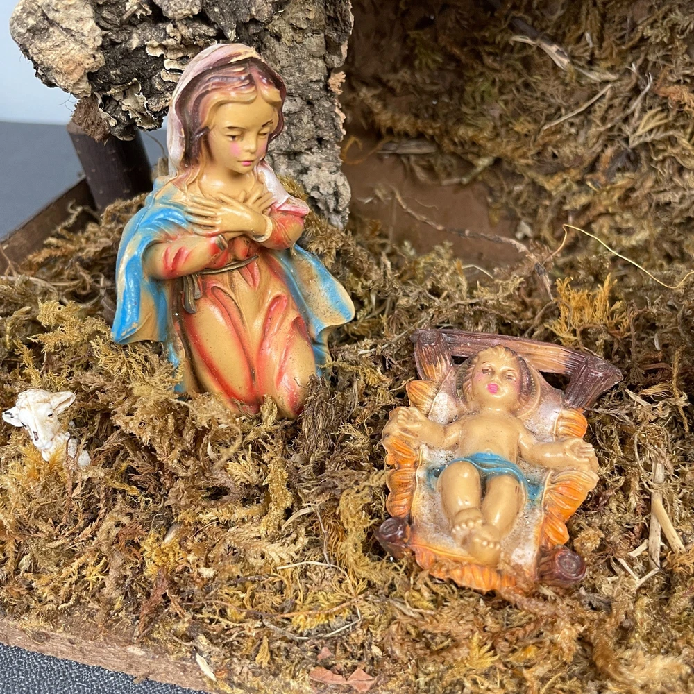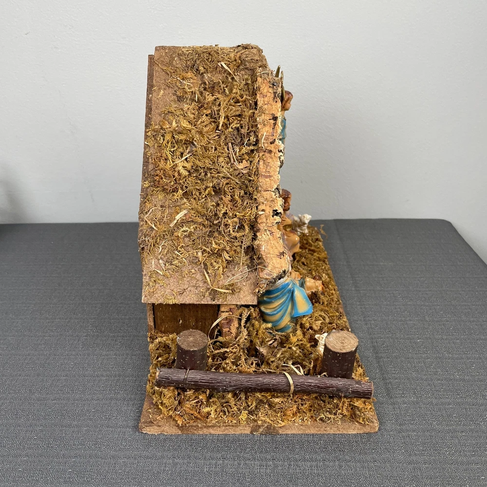 Vintage Christmas Nativity scene. Made in Italy. Good condition - some loose moss. The six figurines are permanently attached. Baby Jesus, Mary, Joseph, Gabriel, two sheep. I'm not sure if there are figures missing. The base measures 12" x 6" and the piece is 9" tall.
