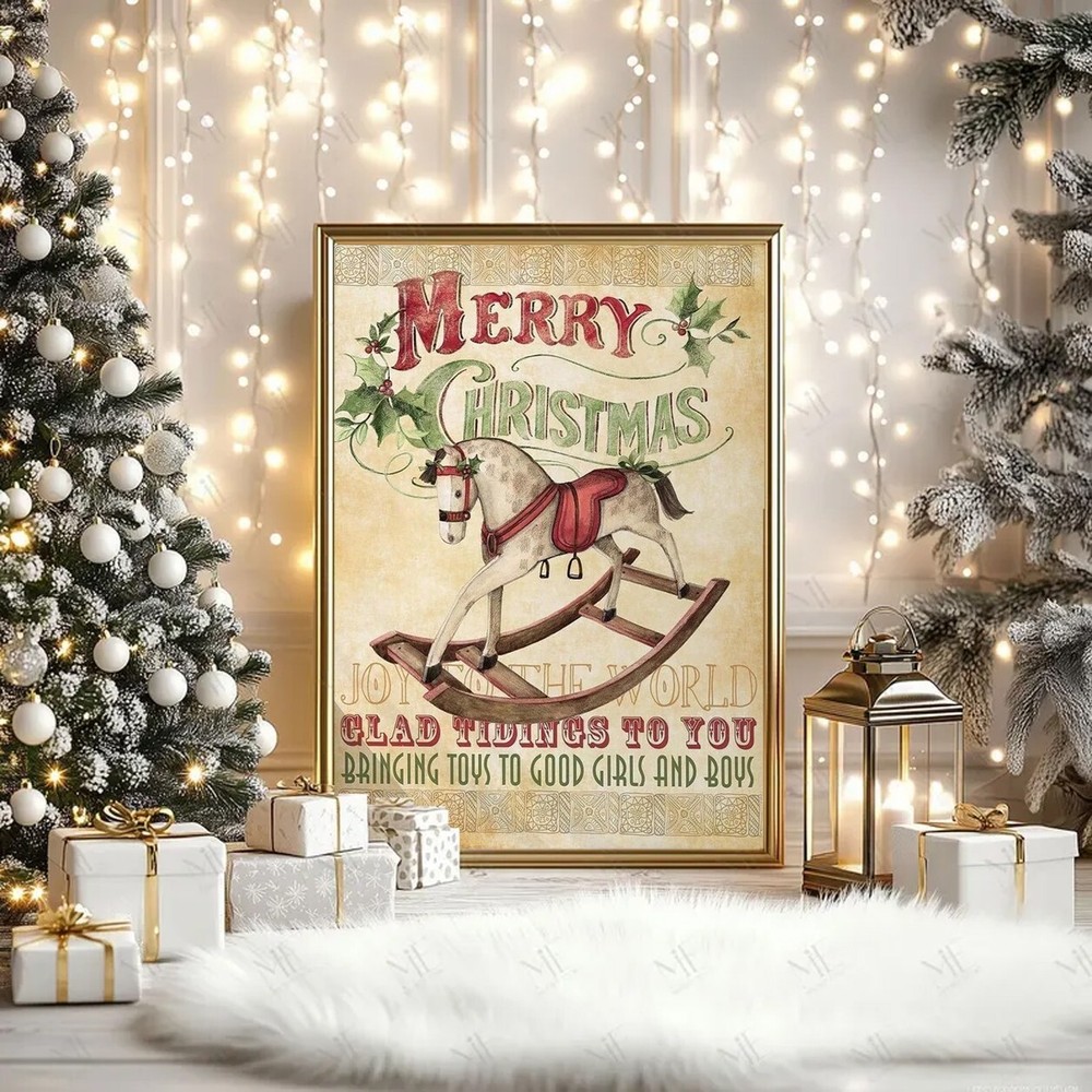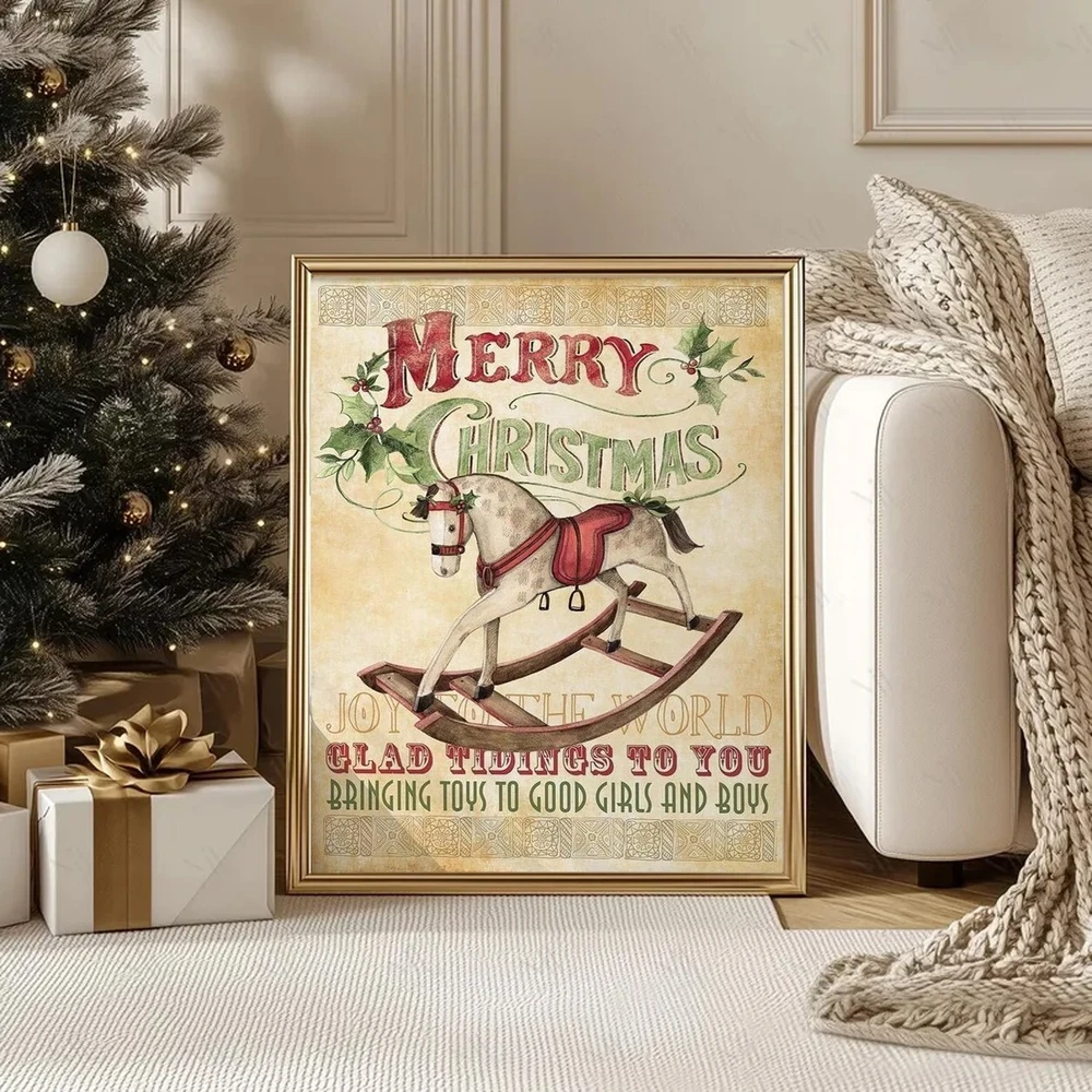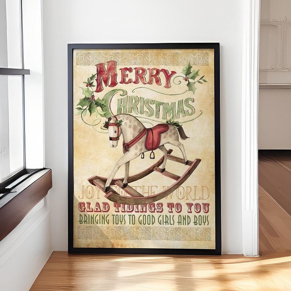 Vintage Christmas Poster Wall Art, Victorian Rocking Horse Wall Decor, No Frame