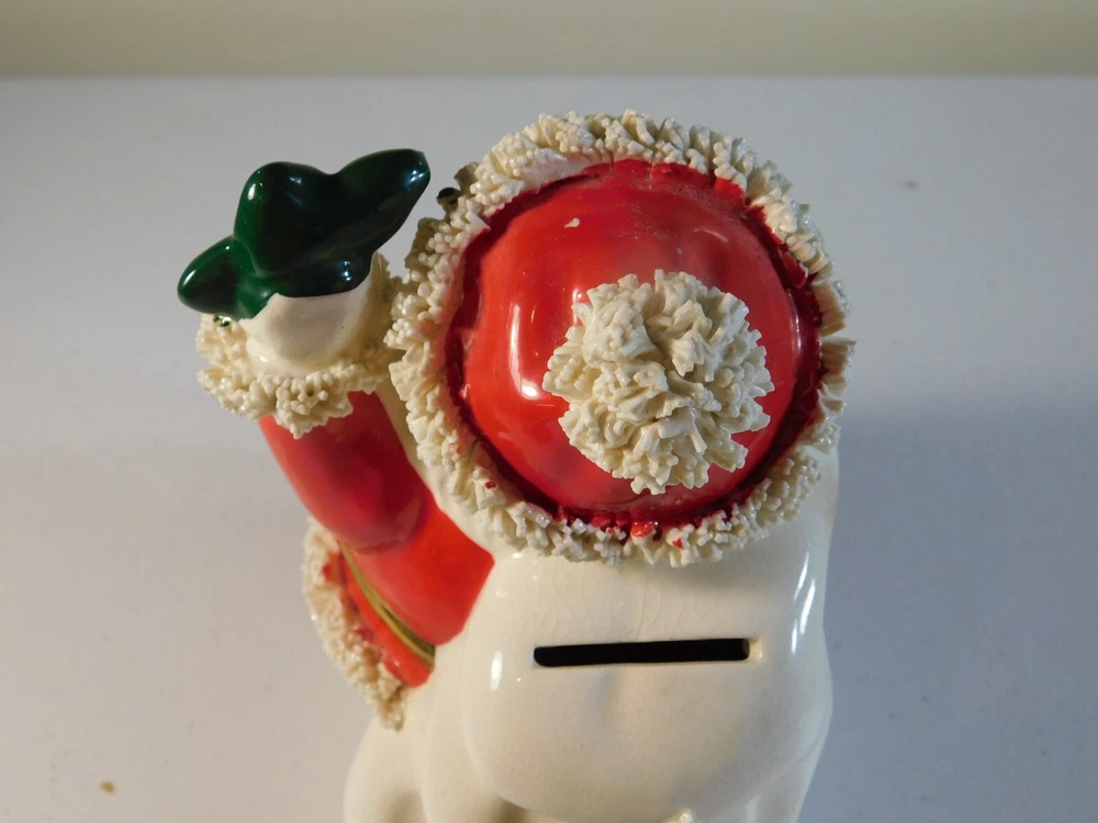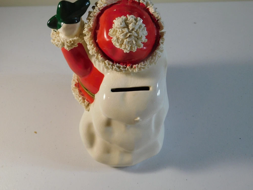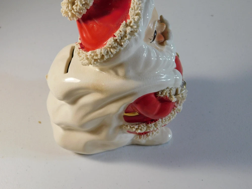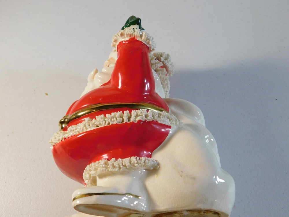 This vintage Christmas figurine features Santa Claus holding a spaghetti bank, perfect for adding a touch of festive charm to your holiday decor. Measuring 6 inches in size, this ceramic and porcelain piece is part of the Classic Collection and has a 1950s style. The multicolor design and seasonal theme make it a great addition to any collection or display. Made in Japan, this Santa figurine is a must-have for adults who love collectibles. The intricate details of the spaghetti bank and the Santa's robe make it a unique and fun piece to showcase during the holiday season. Add it to your collection today and enjoy its timeless beauty for years to come. This is a 1950's vintage Santa Spagetti Christmas bank. It has mild crazing on back and the stopper on bottom is a little dry rotted. The figure/bank itself is free from any damage and paint loss. It is a grea piece to add to your collection. Bid with confidence