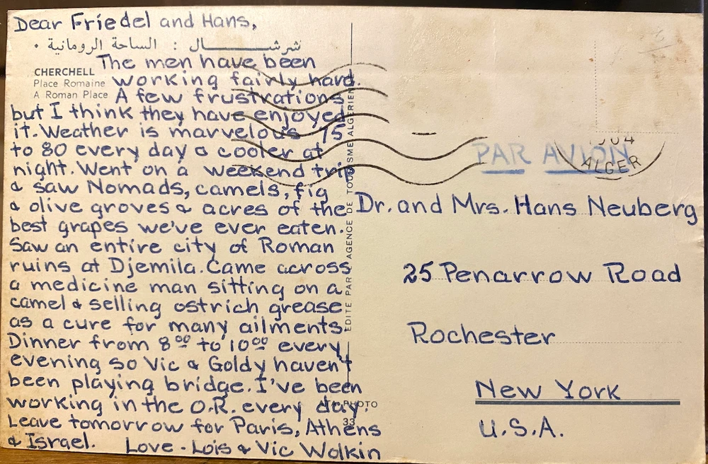Vintage standard-sized chrome color postcard with a view of women in white burqas sitting beneath gnarled trees in the Place Romaine (Roman Place) in Cherchell, Algeria. Back caption reads, "CHERCHELL Place Romaine A Roman Place". Informative handwritten note reads, "The men have been working fairly hard but I think they have enjoyed it. Weather is marvelous. 75 to 80 every day and cooler at night. Went on a weekend trip & saw Nomads, camels, fig & olive groves & acres of the best grapes we've ever eaten. Saw an entire city of Roman ruins at Djemila. Came across a medicine man sitting on a camel & selling ostrich grease as a cure for many ailments. Dinner from 8 to 10 every evening so Vic & Goldy haven't been playing bridge. I've been working in the O.R. every day. Leave tomorrow for Paris, Athens & Israel." Published by the Agence de Tourisme, Algeria. Divided back, posted to New York from Algeria, 1964 or 1984, but missing stamp. Good condition. See photos. Ships securely in a protective plastic holder. Free postage to US addresses. We cheerfully combine postage for least cost to other destinations. (Request an invoice or receive postage refund after purchase.) Sorry -- no tracking available on flat items under $20, which ship at letter rate. Thanks for looking! See more vintage views at our eBay store, Montana Gael.