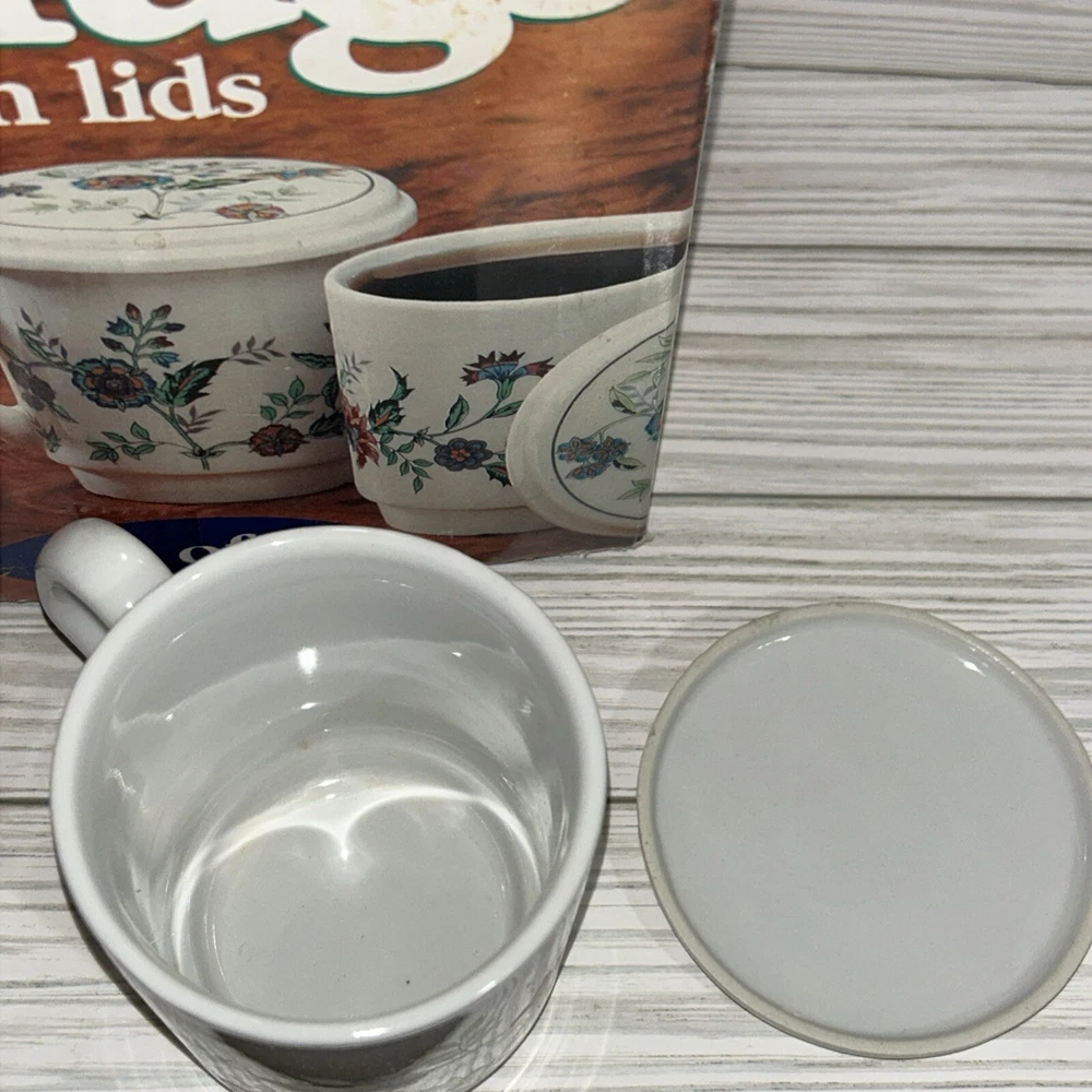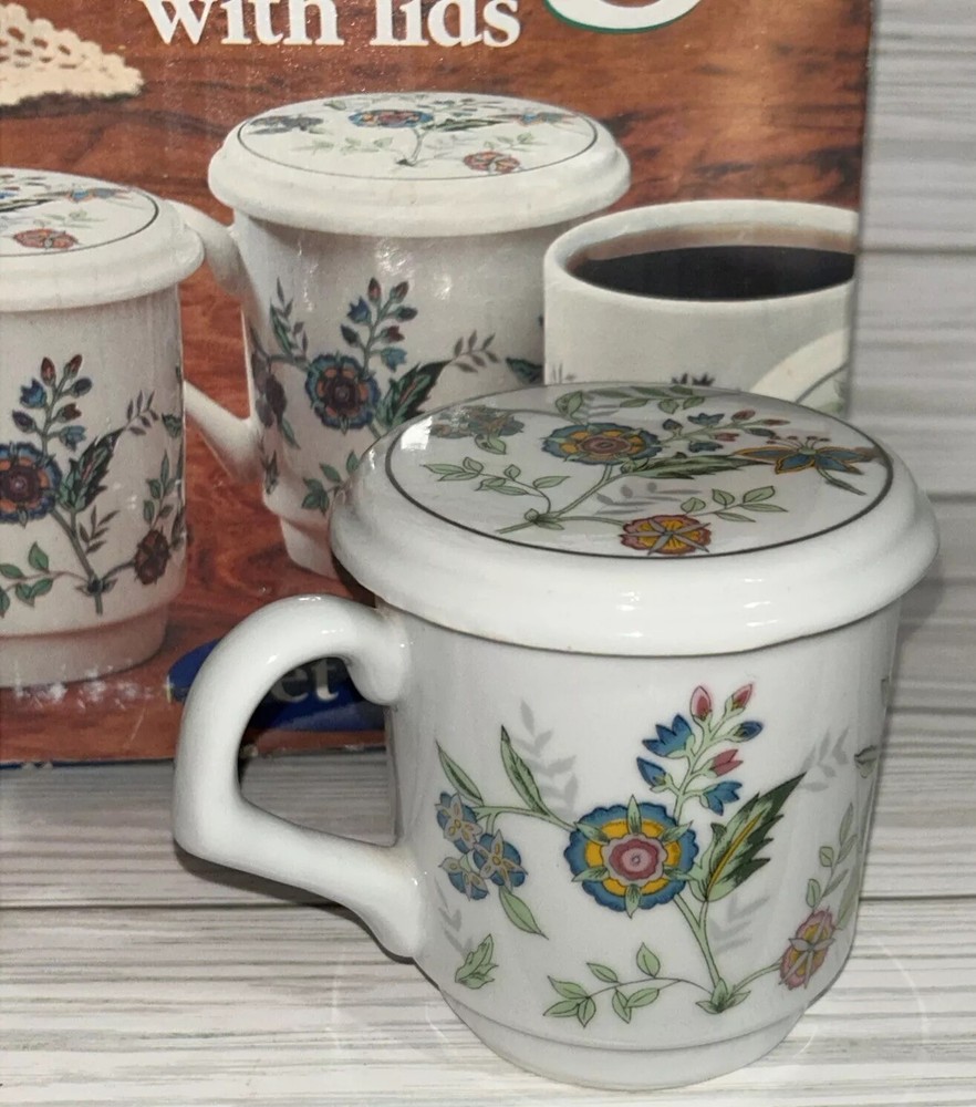 Vintage Circa 1998 NIB NOS Tea Mugs Cups With Lids Floral Porcelain Set Of 4 These Are New The Box Has Some paper missing and some damage but cups are all in new condition have never been used made in Georgia USA Very Cute Set