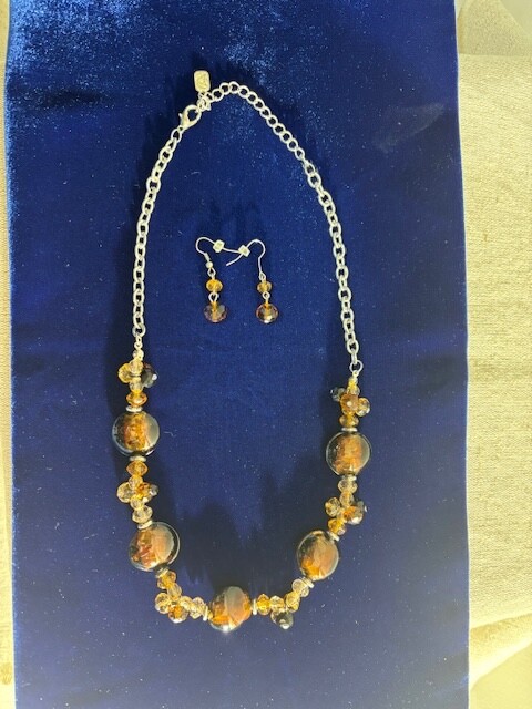 Crafted with a vintage touch, this beaded necklace features faceted glass stones in a vibrant citrine hue in various shades. Complemented by a matching pair of pierced earrings, this set adds a touch of retro elegance to any ensemble. The lobster clasp closure ensures a secure fit for daily wear or special occasions. The citrine colored beads are highlighted by the subtle shine of the metal spacer bead and chain. Accent beads are thread with metal pins as well. Whether you're dressing up for an event or accenting your daily look, this necklace and earring set is a timeless addition to your collection. Does have a branded tag see photos.