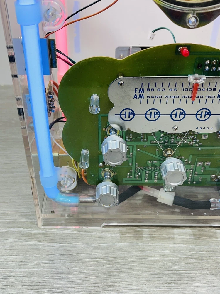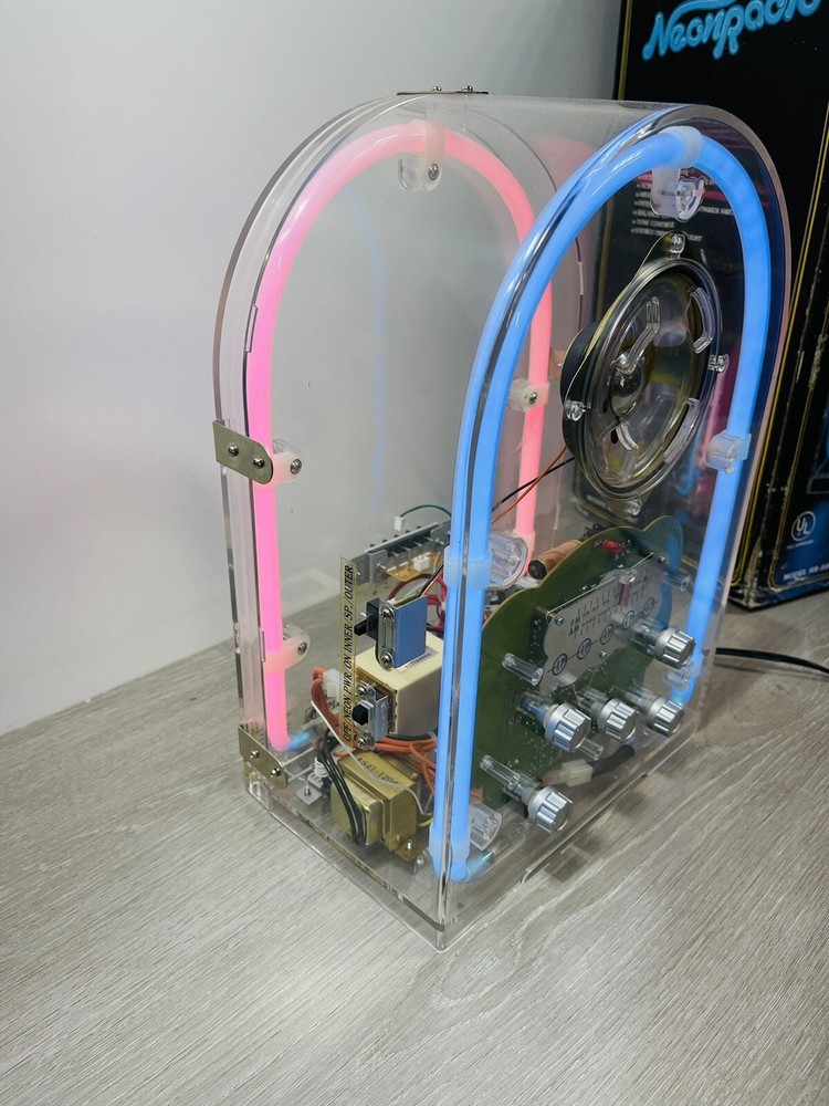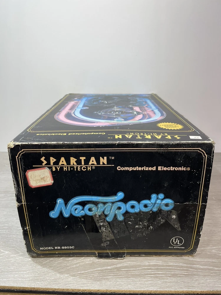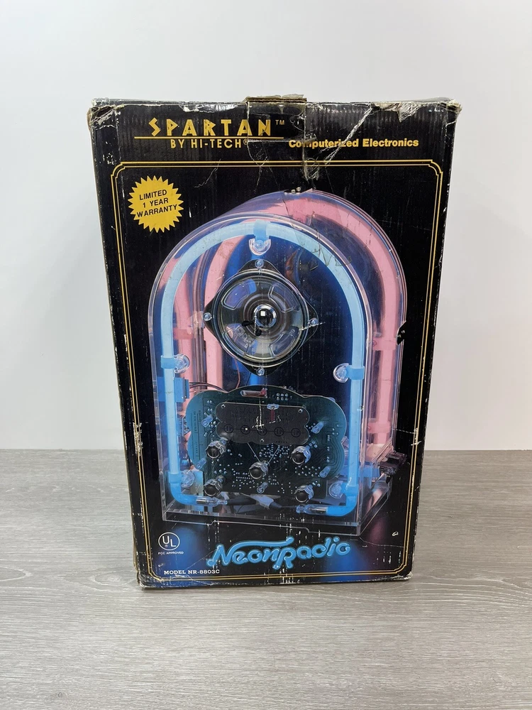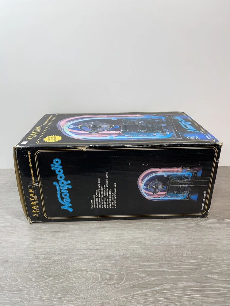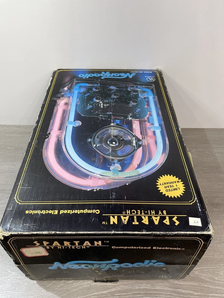The vintage Spartan by Hi tech neon radio is in excellent working condition, it measures 14 1/4 inches high by nine and three-quarter inches long by 7 inches wide, the neon can be turned on and off independently from the radio, which can be turned on and off by itself, the cassette player works great. There is minor scuffs and scratches and a couple more noticeable when up close on the rear and side acrylic. The box is solid, but does have a lot of wear. It comes with both pieces of Styrofoam and original manual . Thank you for Visiting Northern Michigan's Ebay Store, We offer a wide variety of New and used items, Please view all photo's, as they are the best description of each item, we value our customers and do our best to offer items as described. If by chance we miss something please contact us, as customer satisfaction and service is our number one goal. Thank You for visiting and have a great day!
