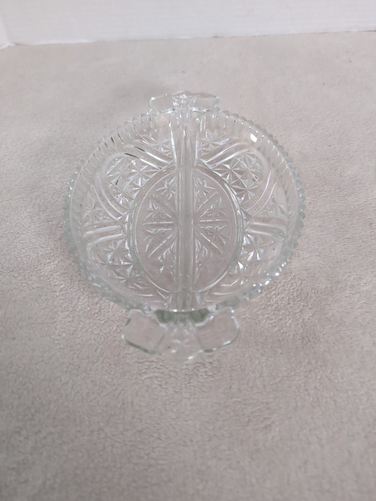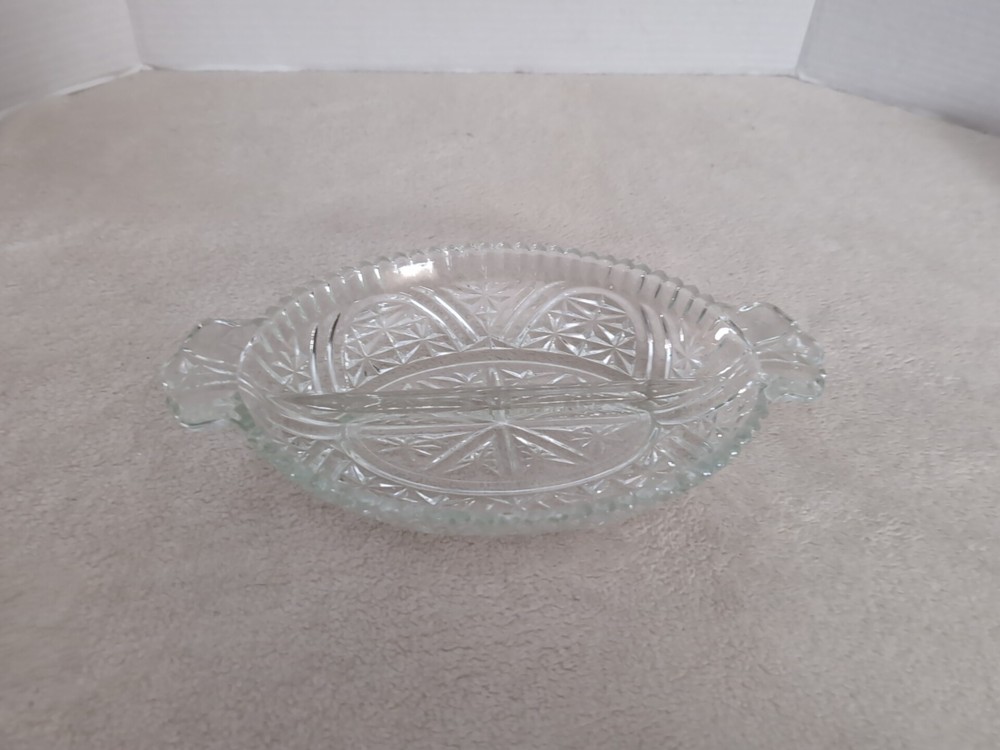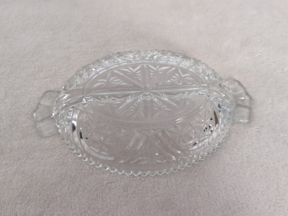 Color:ClearYear Manufactured:1960Original/Licensed Reproduction:OriginalProduction Style:Cut GlassMaterial:GlassShape:OvalBrand:CandyNumber of Compartments:2Vintage:YesType:Candy DishModel:candyTime Period Manufactured:1960-1969