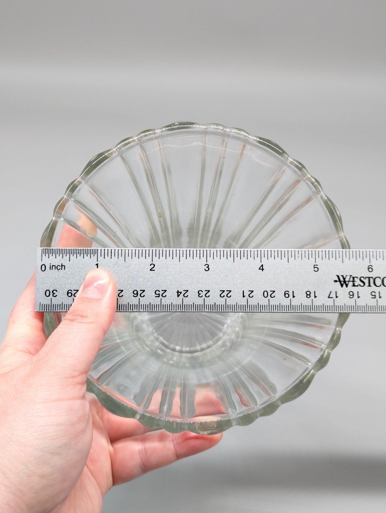 Shipping is calculated and will vary depending on location. This vintage clear cut ribbed glass flower vase exudes elegance with its wide and large design, standing at 7 inches tall. The intricate ribbing and cut glass production style add a touch of sophistication to any home decor. This simple but nostalgic design ensures a timeless piece that complements any flower theme, making it a perfect addition to your collection of decorative pottery and glassware. The wide opening and generous depth can accommodate large bouquets.