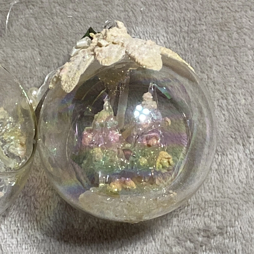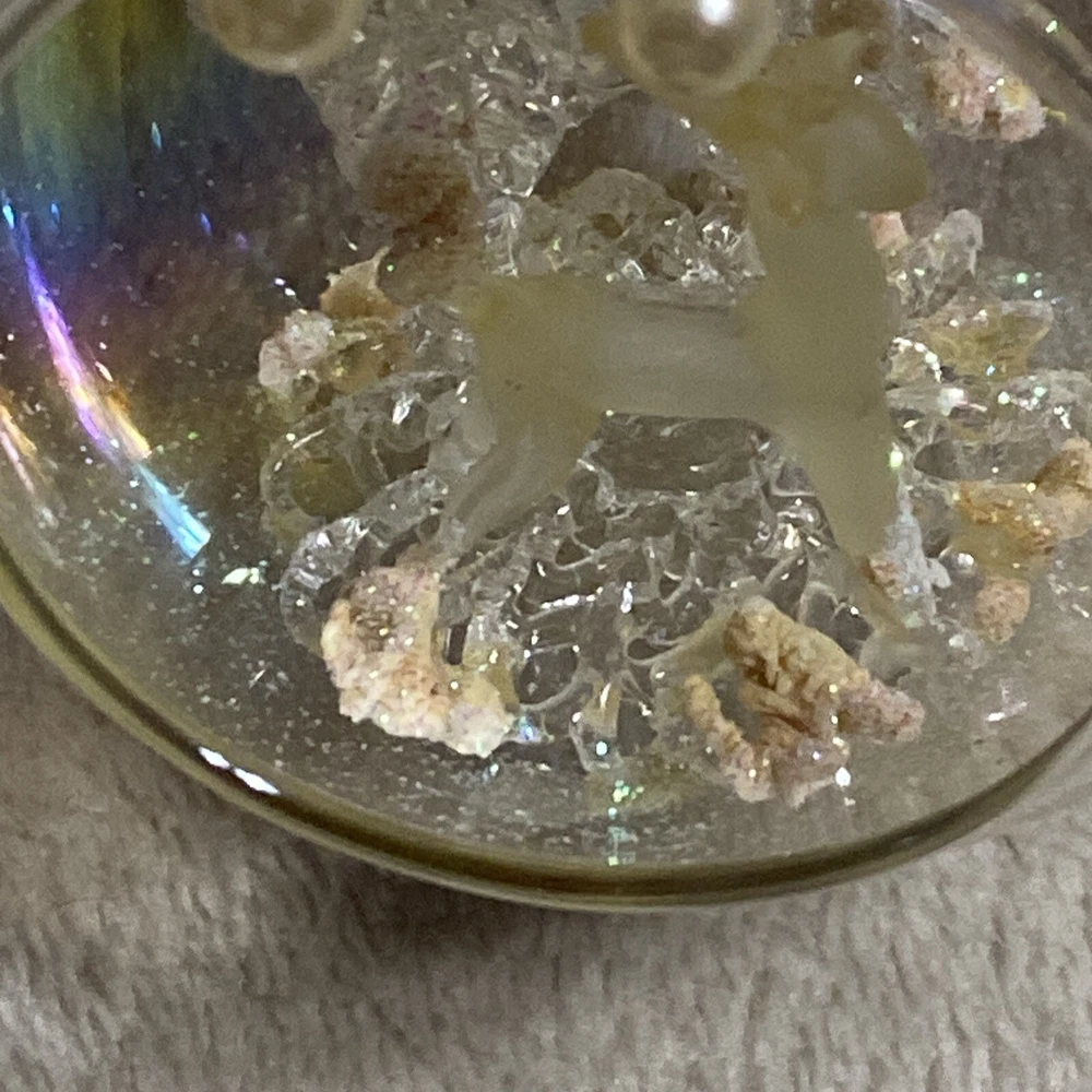 Beautiful blown glass diorama ornaments! The glass throws a rainbow of pastels onto the diorama inside making the trees look colorful. Each ornament has 2 trees and an iridescent deer inside on a decorated “ground”. The tops are also decorated with ribbons and sparkle. One top has a Pearl that fell off but it is still in the box. They all have a box for storage. They are quite magical!