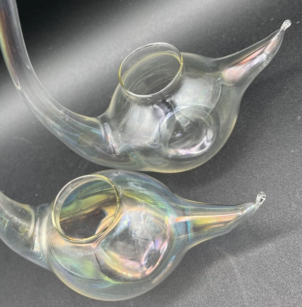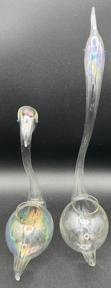 Add a touch of elegance to any room with this pair of vintage glass swan plant propagation air vases. The iridescent finish and hand-blown glassmaking technique make these vases a unique addition to your collection. Measuring 10 inches in height these iridescent clear glass vases are perfect for displaying in a room with any theme. The swan shape adds a touch of whimsy to your décor. These vases are perfect for any occasion and will be a conversation starter.