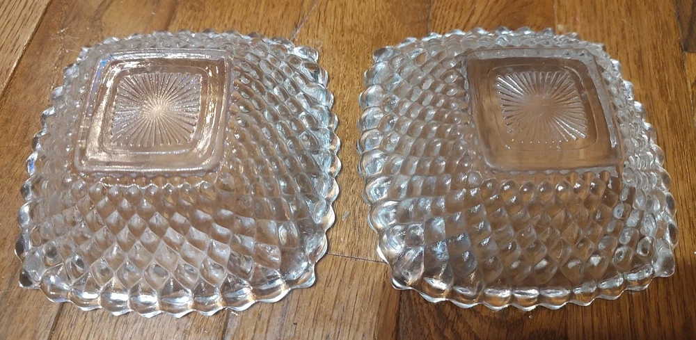 2 Vintage Small Clear Hobnail Diamond Square Trinket Or Serving Bowls 4.5", good condition.