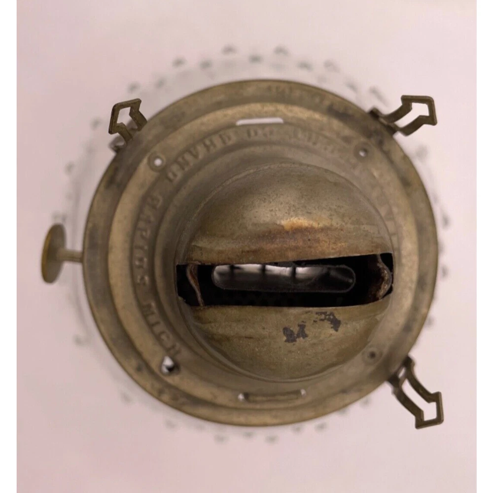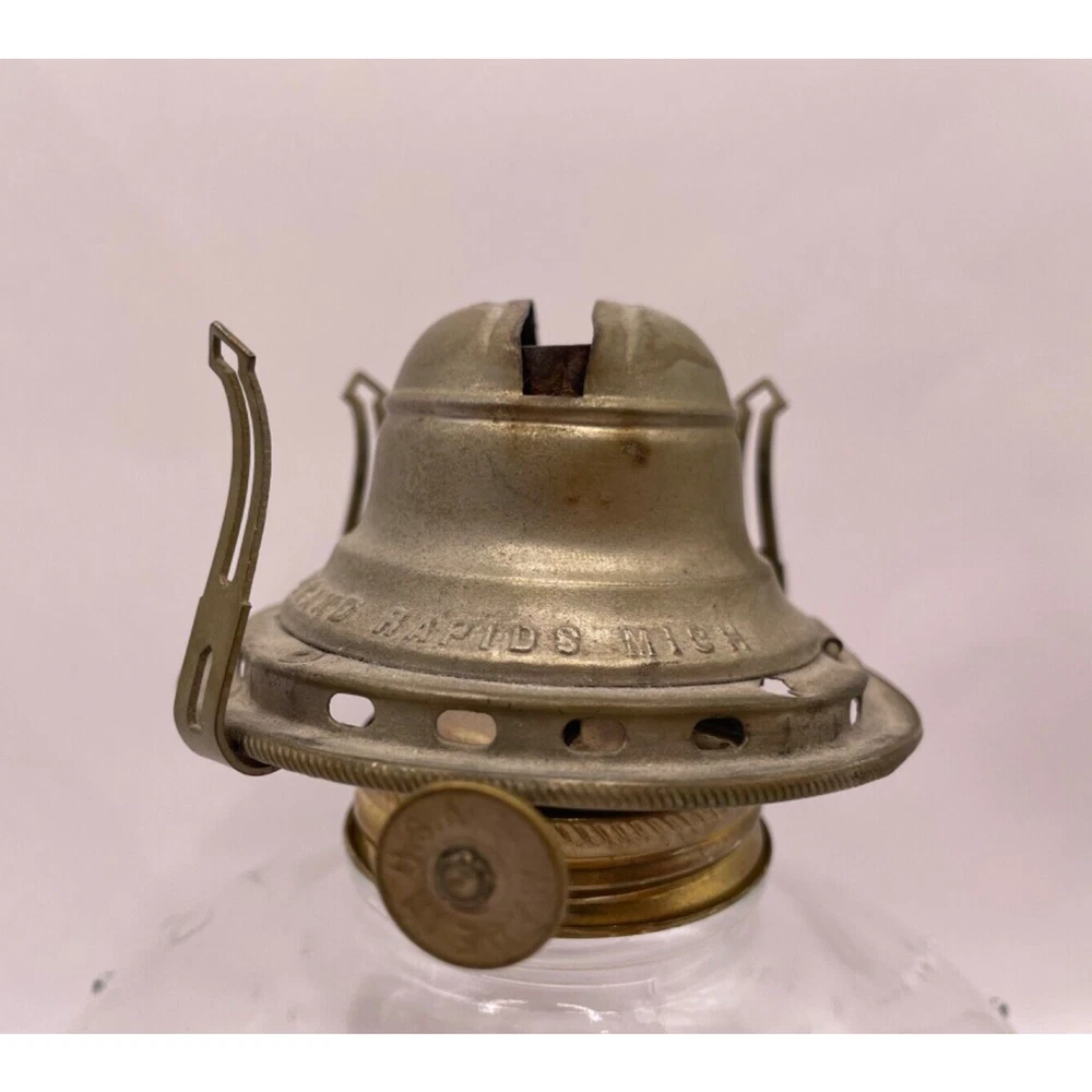 Antique: No Finish: Oiled Power Source: Oil Material: Brass, Glass Size: Small Vintage: Yes Featured Refinements: Oil Lamp Chimney Country/Region of Manufacture: United States Type: Oil Lamp Color: Clear Item Height: 12.5 in Brand: White Flame Light Co Grand Rapids Mich Item Width: 4.5 in