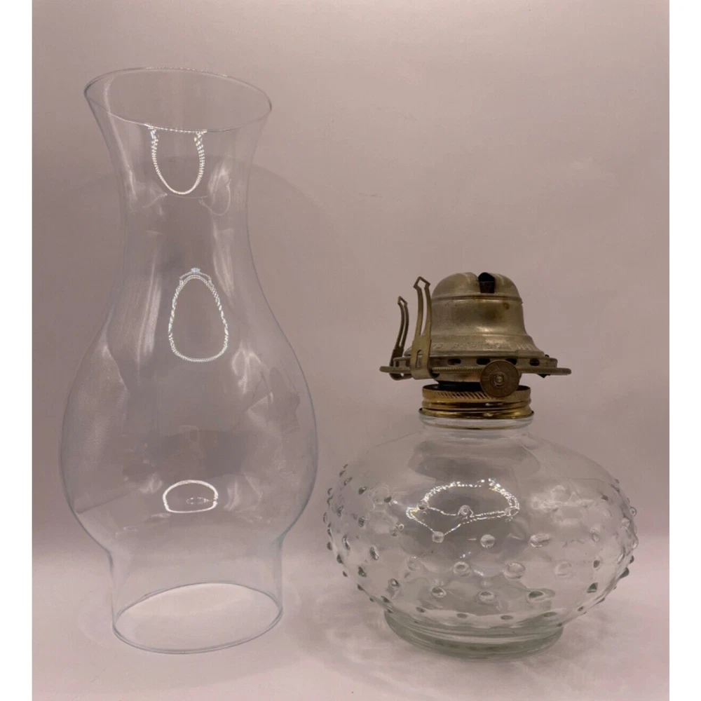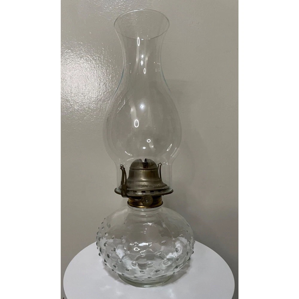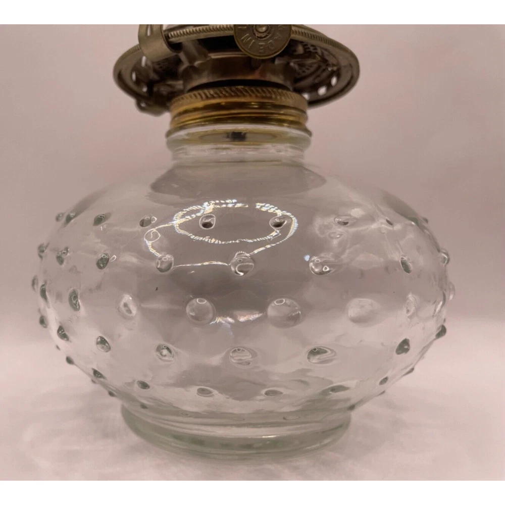 Add a touch of vintage charm to your home decor with this small, clear hobnail oil lamp from White Flame Light Co Grand Rapids Mich. The lamp features a brass and glass construction, with an oiled finish, and is powered by oil. Measuring 12.5 inches in height and 4.5 inches in width, it is the perfect size for any room. This antique-style lamp is a great addition to any collection and is perfect for use as a decorative piece or for adding ambiance to any space. With its vintage look and feel, it is sure to be a conversation starter. Don't miss out on this unique piece of American-made history. This exquisite oil lamp is in good shape. It has no cracks, no chips. However, one of the metal prongs holding the glass shade is missing and the wick is missing as well. Please refer to pictures.