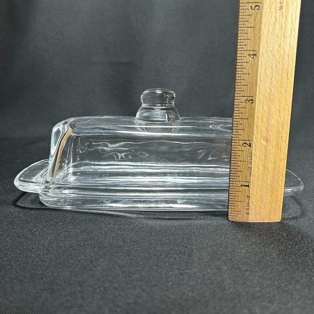 This vintage glass butter dish is designed to hold 1/4 pound of butter. It is made of clear pressed glass, measuring 8 inches in length and 3 inches in height. The dish features a plain pattern and has one compartment. The unmarked brand item comes unboxed and is a rectangular shape, perfect for storing and serving butter in a classic and elegant style.