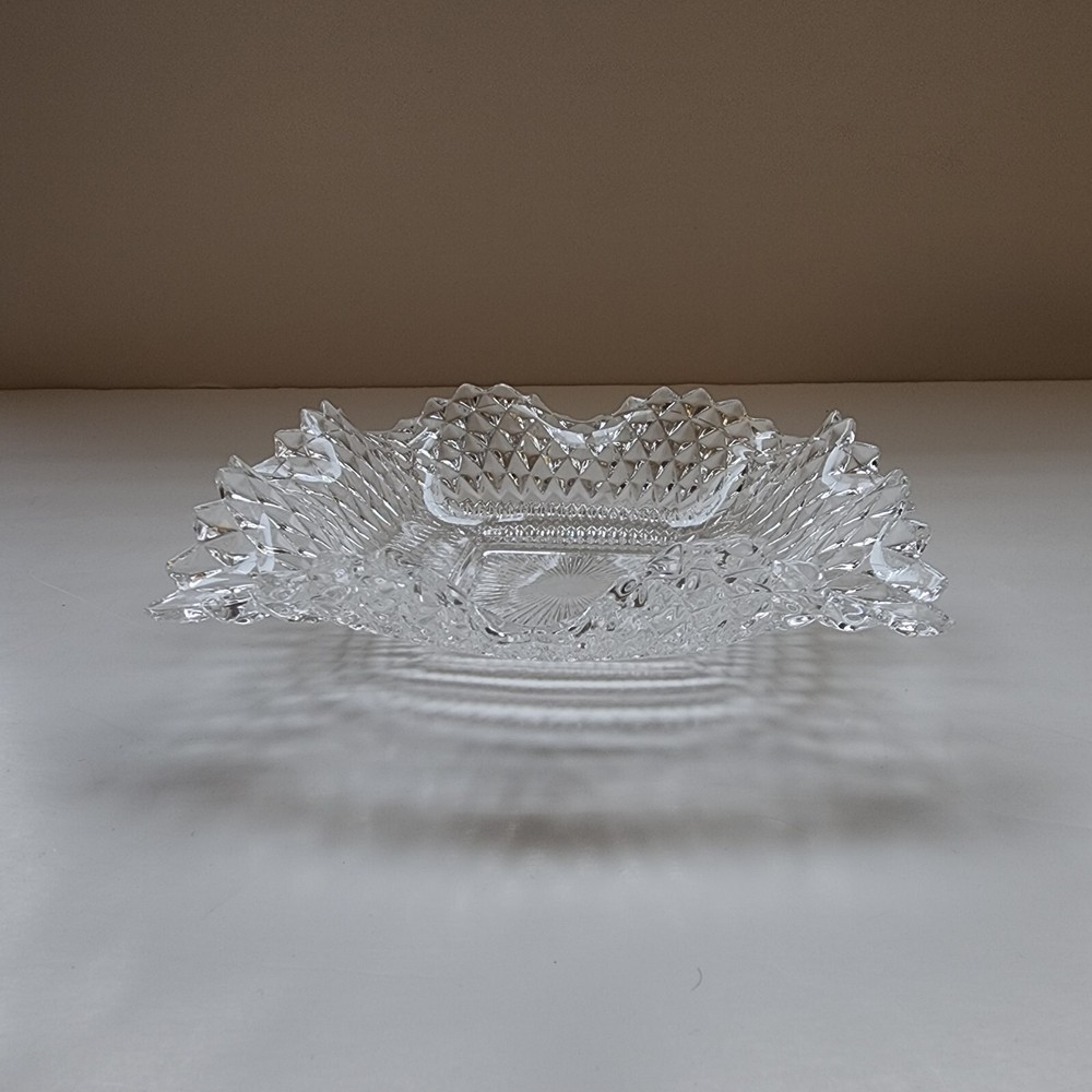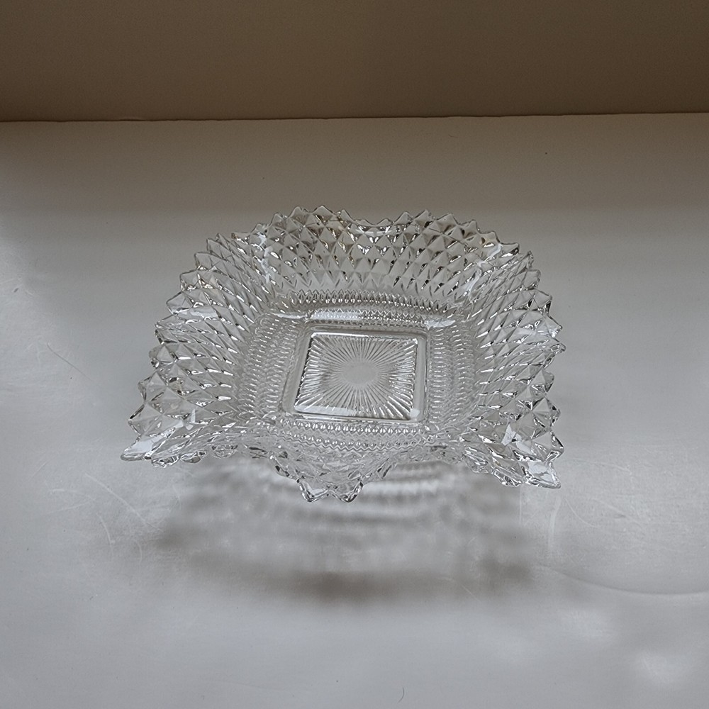 This vintage candy/nut dish is a clear, pressed glass dish with a diamond pattern and scalloped edges. It has a square shape with a single compartment and measures 6.75 inches in width and 1.5 inches in depth. The glossy finish and ruffle suggest a classic and elegant design, typical of pressed glass production style in the United States. Perfect for serving candies or nuts, this dish is a charming addition to any table setting or home decor with its timeless vintage appeal.