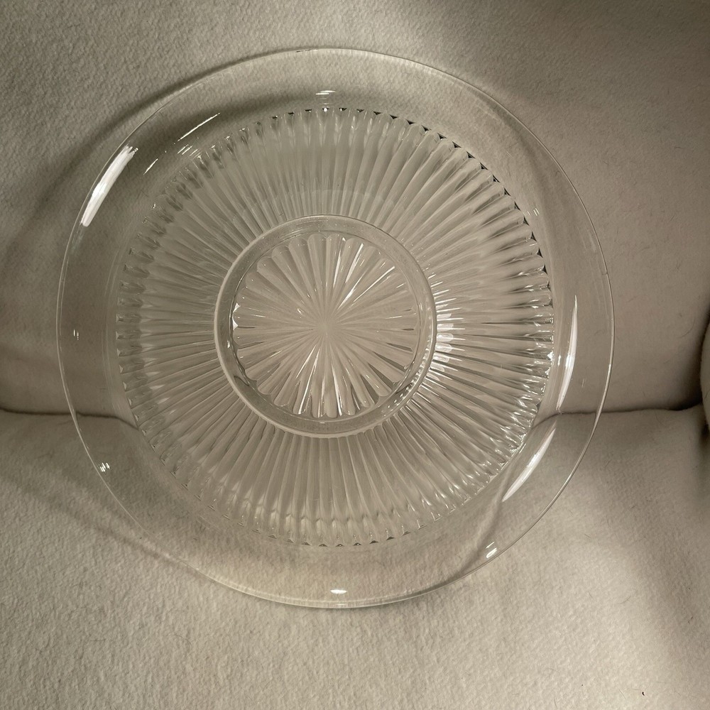 This vintage clear glass serving bowl features a round shape with ribbed detailing and a wide rim, measuring 11.25 inches in diameter and 2.5 inches in height. Made of pressed glass using a fused glass production technique in the 1960s, this mid-century modern piece is unmarked but likely of original production. With a decorative and dishwasher-safe design, this 2.8 lb serving bowl is perfect for all occasions, adding a touch of retro charm to any table setting. Excellent condition. No chips or cracks.