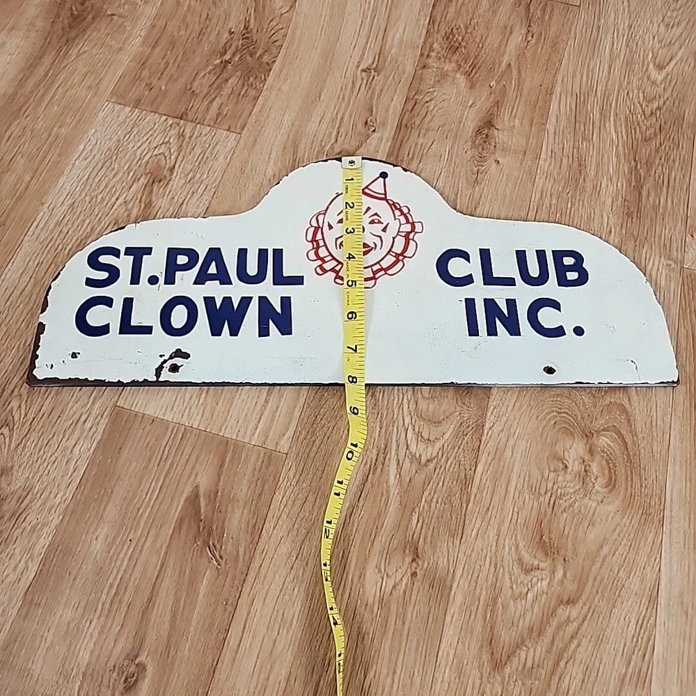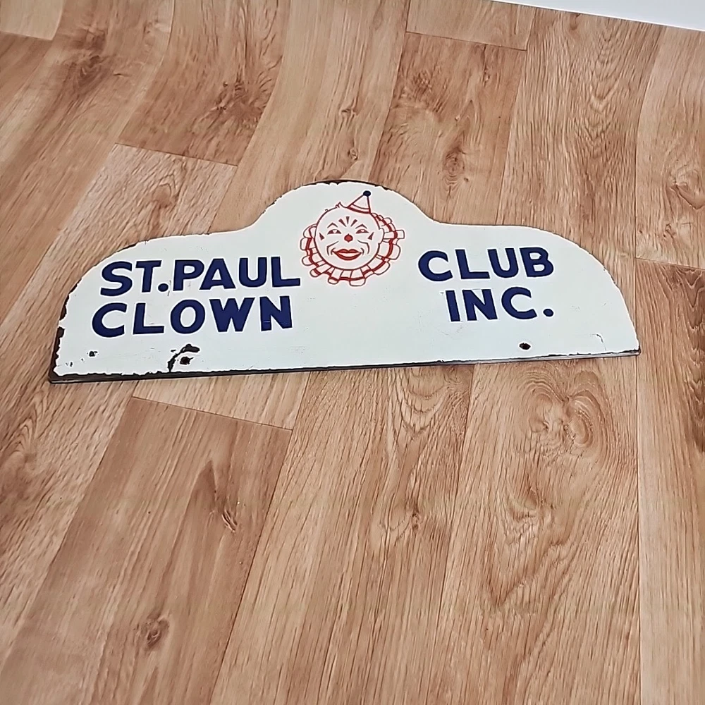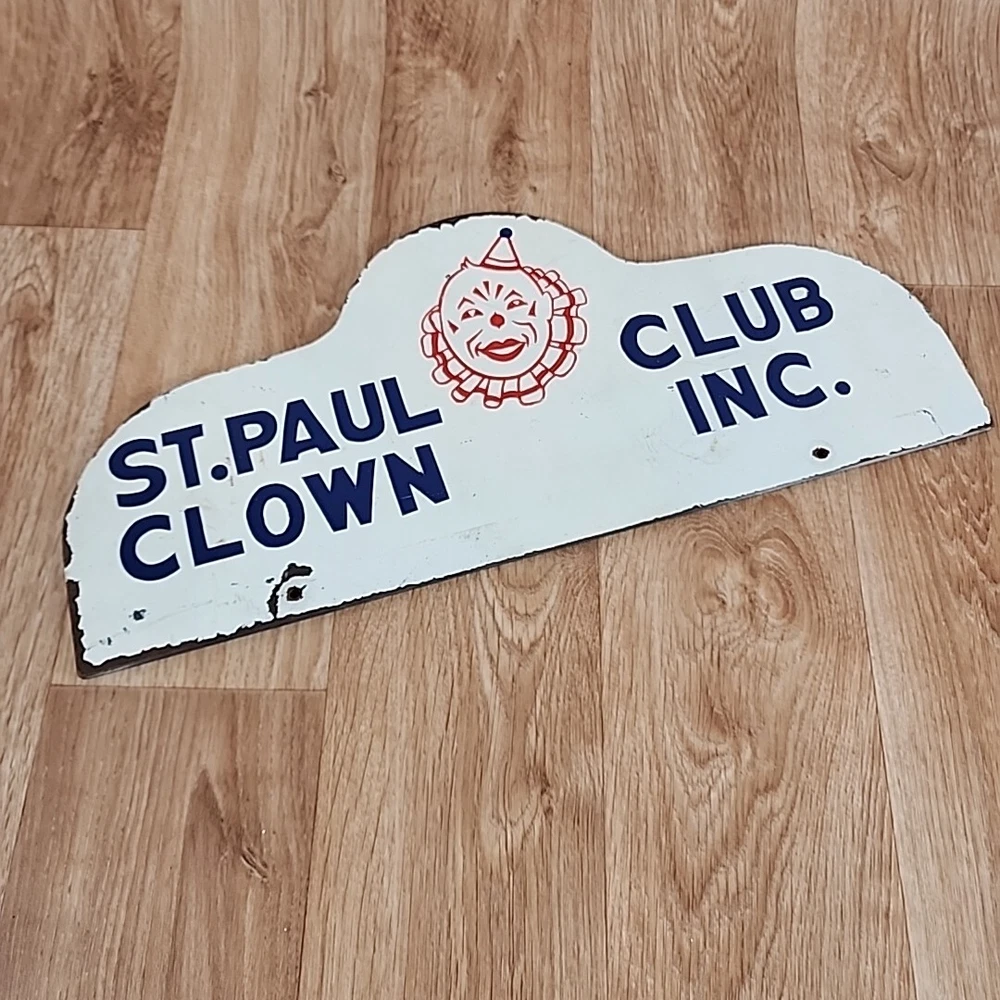 This vintage clown sign is a must-have for any collector of circus and carnival memorabilia. The double-sided name plate features the St. Paul Clown Club and is a great addition to any collection of vintage signs. Made in the United States, this sign is perfect for those who appreciate the history of clowning and the Clowns of America. The sign is ideal for display in a home, office, or man cave, and would make a great gift for anyone who loves circus and carnival history. The profession of clowning is represented on this sign, along with the theme of Circus & Carnival. This item is classified under Collectibles, Historical Memorabilia, Fairs, Parks & Architecture, and Other Circus & Carnival categories. Add this vintage clown sign to your collection today!