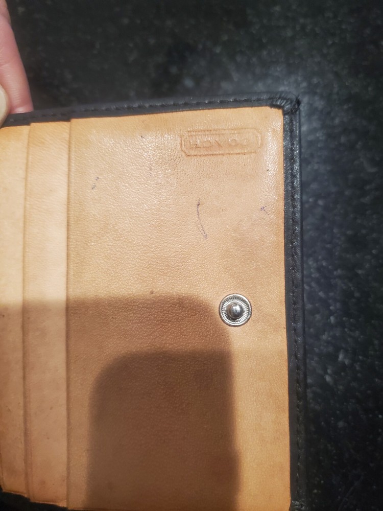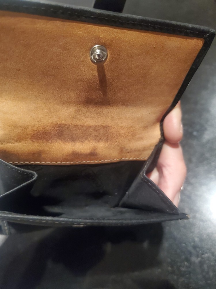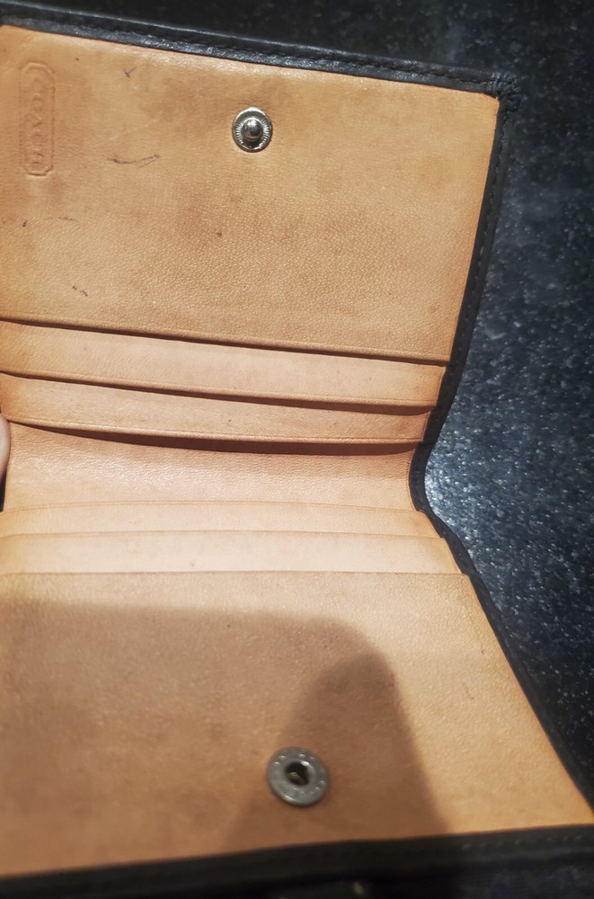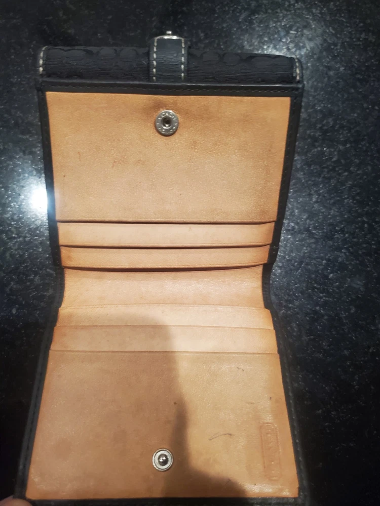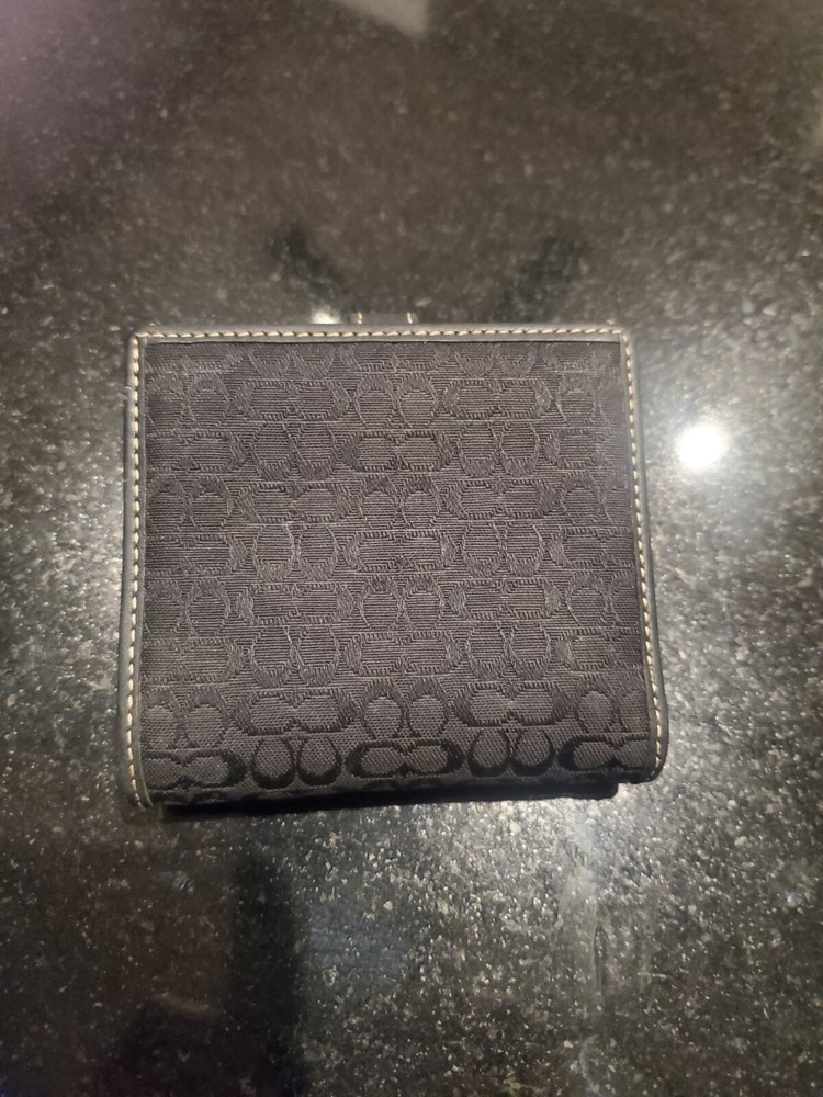 This is a Vintage Coach Mini Signature Wallet in black and gray canvas with a bifold design featuring a buckle snap closure. It is made of canvas and leather material, with a leather fabric type and includes credit card slots for organization. The wallet showcases the Coach logo as an accent and is designed for women.