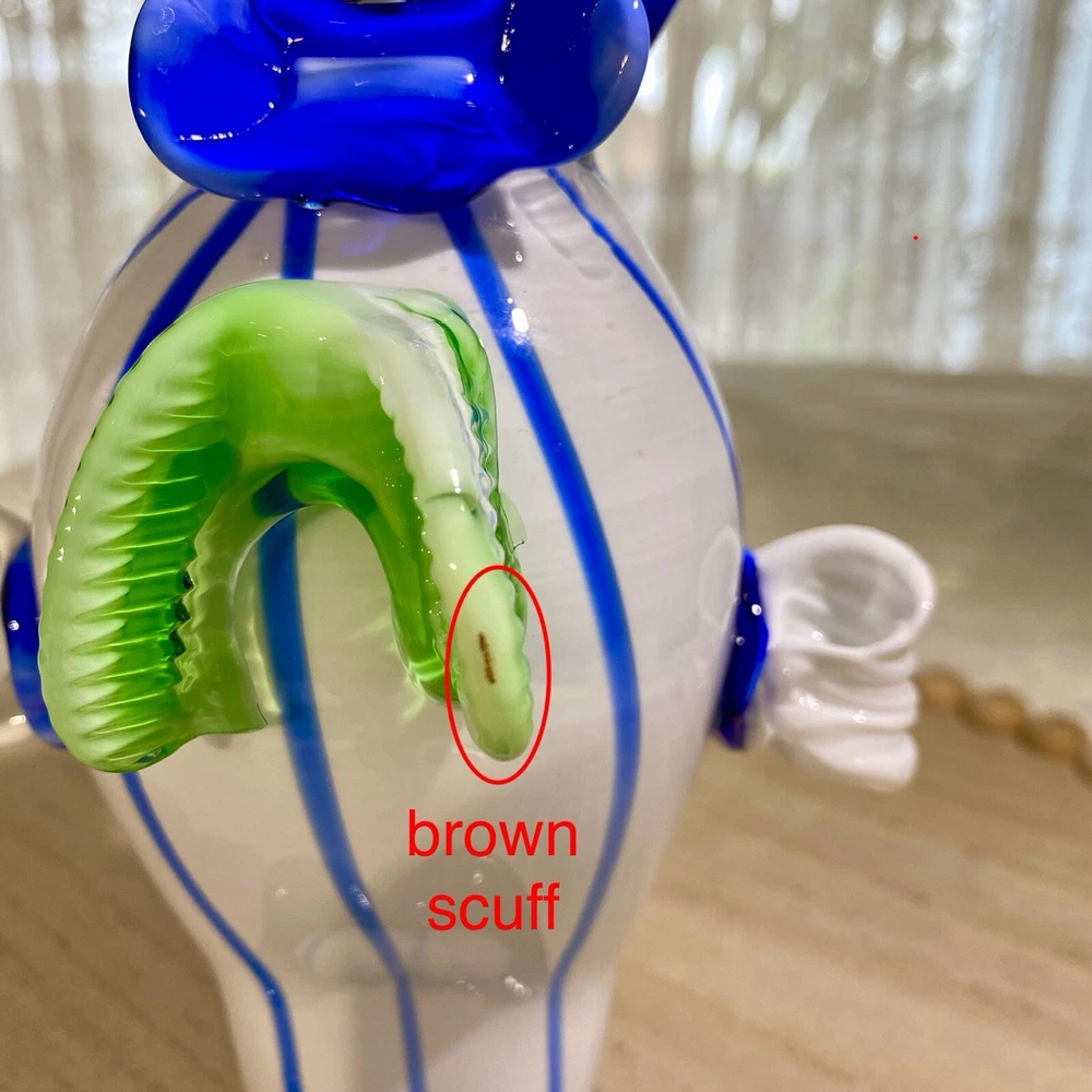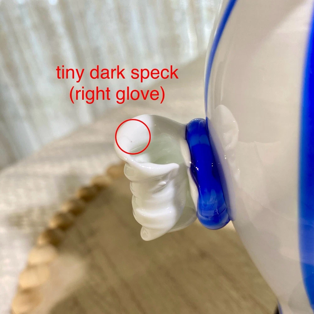Acquired in the early 2000's, this item is inspired by Murano / Venetian glass but is NOT believed to be authentic. In an attempt to establish provenance, The Seller researched this item online and was unable to find another clown that resembles this item. The pointed, striped hat and the color combination makes this whimsical clown special in its own right. Height: 9 in Width: 5 in Depth: 4 in Weight: 1 lb, 14.2 oz. These measurements are Seller's best approximations. Vintage. Pre-owned and in good condition. Flaws observed: 1) Brown scuff on green ruffle fronting the belly. 2) Brown scuff on the back of the body. 3) Various faint, dark specks on both white gloved hands, difficult to capture in photographs. No other flaws observed. Internal bubbles are not to be considered flaws and are inherent in handmade art glass. Please see all photos. **PLEASE REVIEW SHIPPING COSTS, which reflect USPS Priority shipping from Hawaii for speedier delivery. If you are not in a rush to receive this item and are willing to wait approximately 18+ days for delivery, lower cost USPS Ground Shipping is available. Please message me requesting this shipping method, which I estimate will cost approximately $26. I can modify this listing for you to reflect the cost of USPS Ground Shipping. SHIPPING: From Hawaii. All items will be weighed, photographed and/or video-recorded while item is prepared for shipment. Shipping of items will always prioritize the care and safety of the item, but at times will use recyclable materials (to include boxes and packaging materials). The packaging may not be aesthetically pleasing, but will be safe and secure. DISCLAIMER: All photographs provided do not use filters with any intent to alter or improve the appearance or condition of the item. All items are inspected carefully and flaws are photographed and presented as transparently as possible to The Buyer. If you have any further questions pertaining to the description of this item, please contact The Seller BEFORE purchasing or making an offer.