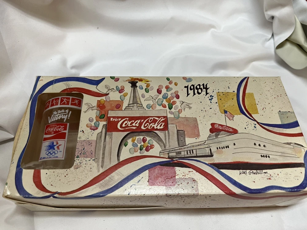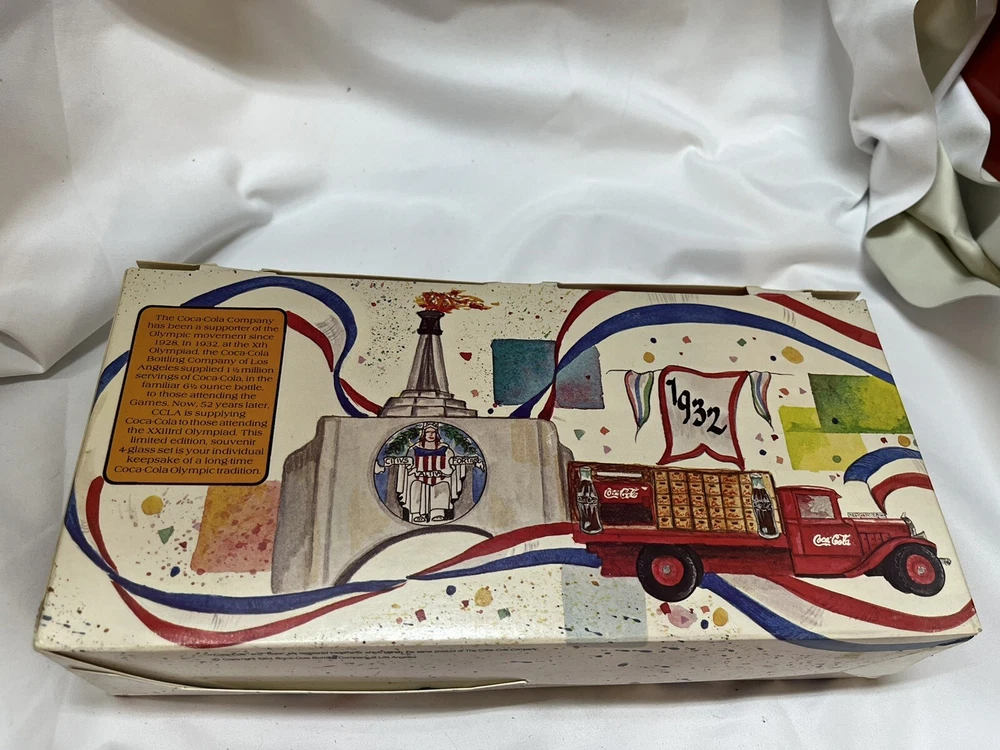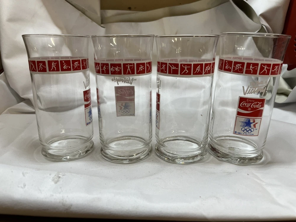 Add a touch of vintage charm to your collection with this 4-piece glass set from the 1984 Los Angeles Olympics. Emblazoned with the iconic Coca-Cola logo, these glasses are perfect for any soda enthusiast or Coca-Cola memorabilia collector. The glasses are in excellent shape and ready to be displayed or used for your next beverage. The set is a great addition to any collection of advertising or soda-related items. The brand name speaks for itself and the glasses are a wonderful representation of a bygone era. Don't miss your chance to own these rare and unique pieces of Coca-Cola history.