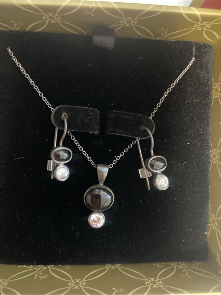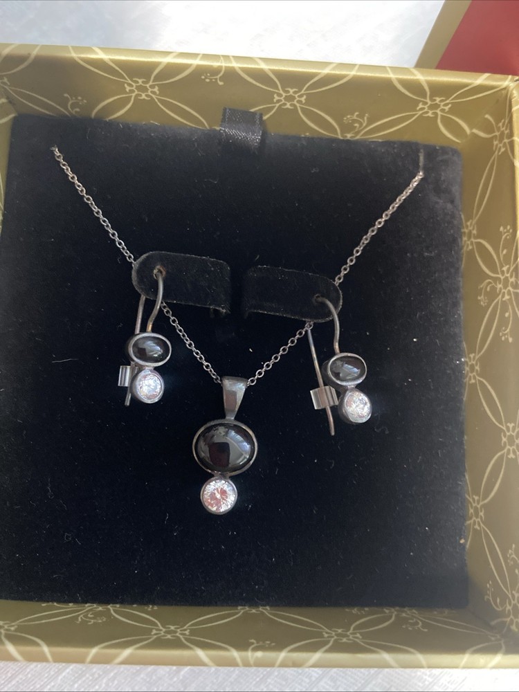 This Vintage Coldwater Creek Sterling and Black Onyx Earring and Necklace Set is a stunning piece of jewelry set featuring a classic black and rhinestone color scheme. The set includes earrings and a necklace, both crafted from sterling silver with a secondary stone accent of cubic zirconia. The vintage appeal and beauty of this jewelry set make it a timeless and elegant addition to any wardrobe, perfect for those who appreciate classic and sophisticated accessories.18" necklace