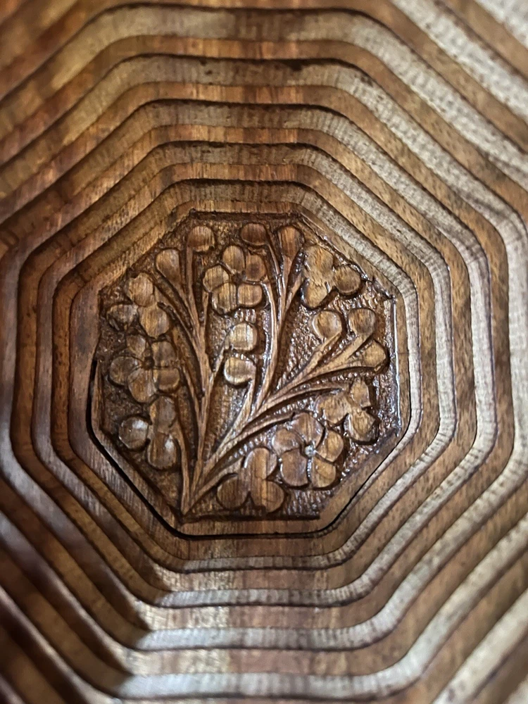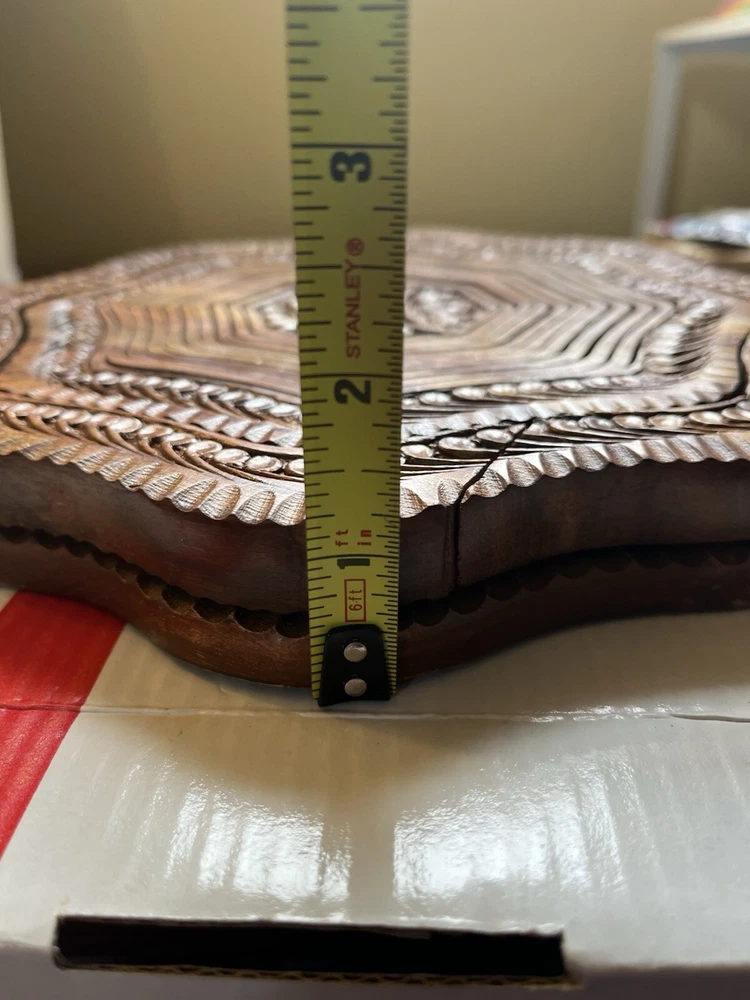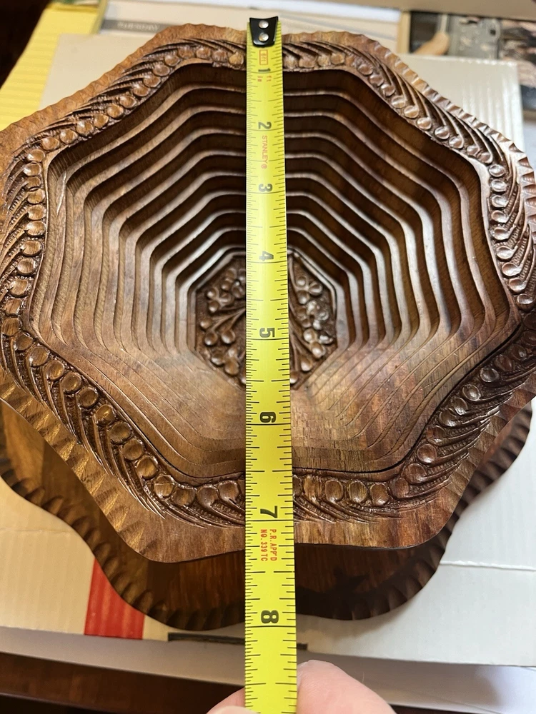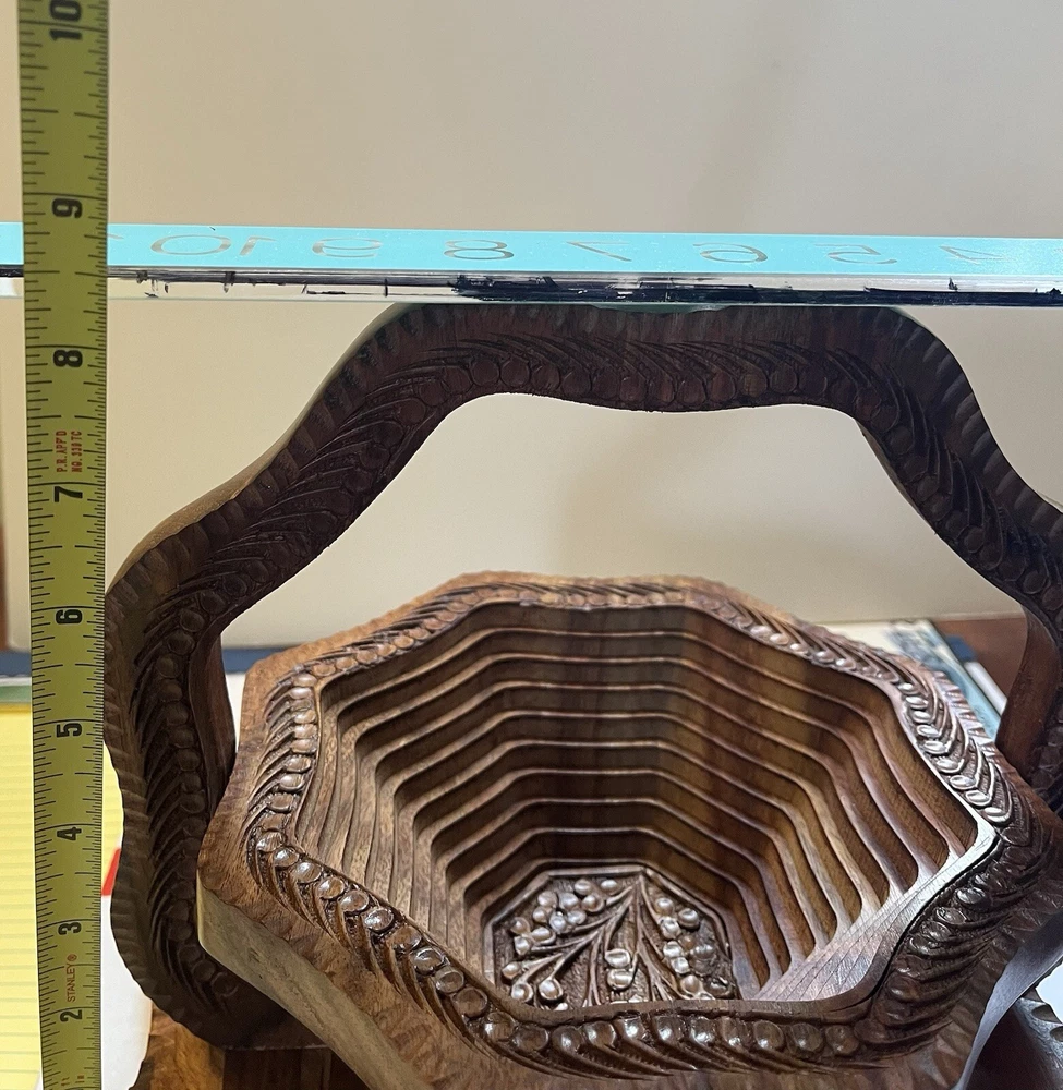This vintage collapsible wooden basket is beautifully crafted hand carved from rosewood, serves as a unique and functional trivet centerpiece. Made by The Wooden Basket Co, it features high quality wood with intricate carvings, a convenient handle for easy transport, and the ability to fold up when not in use. The timeless charm of this piece makes it a versatile addition to any home, perfect for serving as a decorative collectible or as a practical basket for holding items in style. New in box.
