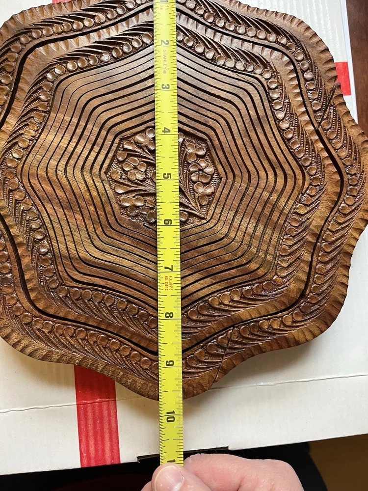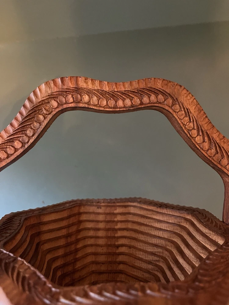 Features: Carvings, Foldable, With Handle Room: Any Room Color: Brown Material: Wood Department: Adults Original/Reproduction: Original Brand: The Wooden Basket Co Customized: No Type: Hand Carved Wood Collapsible Basket Era: Late 20th Century (1970-1999)