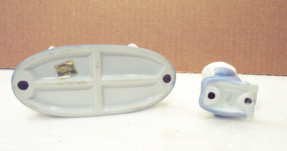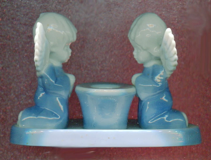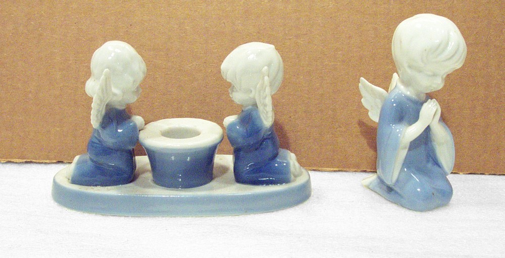 Up for bid is a Blue and White “Praying Angels” Candleholder and Praying Boy Figure. The Candleholder from Colonial Candle Japan features a boy and girl angel, kneeling and praying. The opening for the candle measures 7/8” in diameter. Display measures 3 ½” high x 6” wide x 2 7/8” deep. Candle not included. Figurine is of a Boy Angel, kneeling and praying. It measures 4” tall. Bottom base states 4565. It is not of the same scale as the candleholder. Items were acquired from an estate and are in very good, used condition. No chips. They do not come with their original papers or packaging. They will be carefully wrapped for shipment. PLEASE NOTE: Please Forgive the Lighting. I do my best to describe the item as well as possible. In the event item does not arrive to you as described, Please contact me before leaving a Feedback. --------------------------- Buyer pays Actual Shipping plus $0.60 Packaging Fee. Sorry, No Local Pickups Shipping weight approximately 1 pound 5 ounces. Items are packaged prior to Listing, Therefore No Combined Shipping. --------------------------- As soon as I receive payment, the item will be shipped and a Feedback will be given after buyer receives item and transaction is completed. If I do not receive a response from the winning bidder after one week, the item will be re-listed. Please contract us if you have any questions. Thank you for your consideration. ZDFVZ 130903 ,7x7x7 C1173