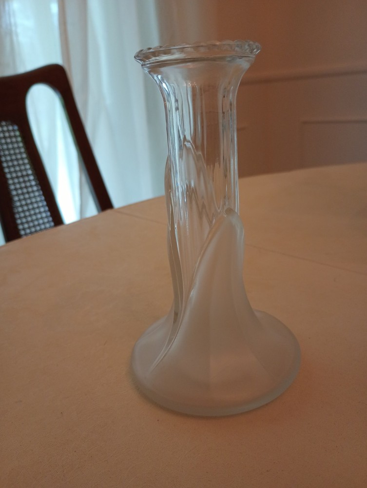 Colonial Glass Candle Holder, possibly from Colonial Candle of Cape Cod, made in Austria. It is characterized by its frosted glass base and clear, tall stem with a leaf design. Here are some key features and details about colonial glass candle holders: Material: Typically made of glass, often with a frosted Candle of Cape Cod is a well-known maker of these candle holders.