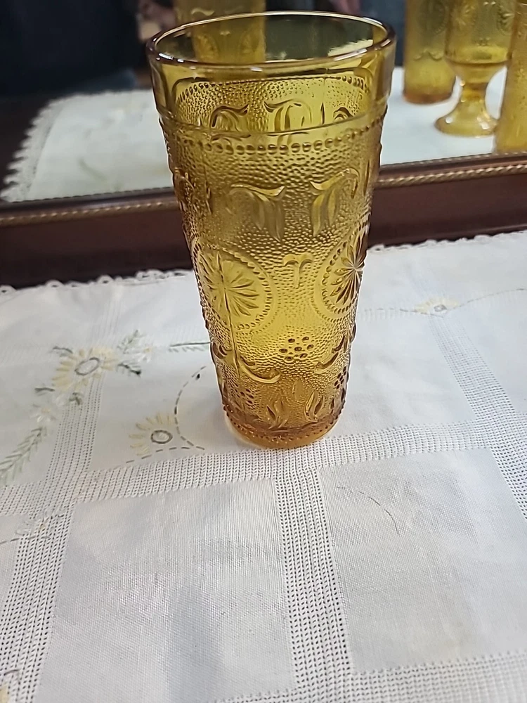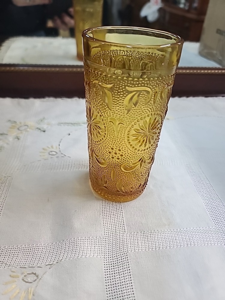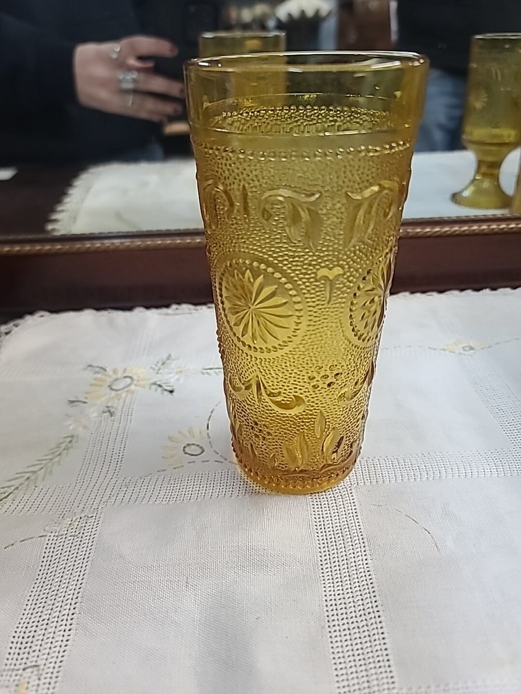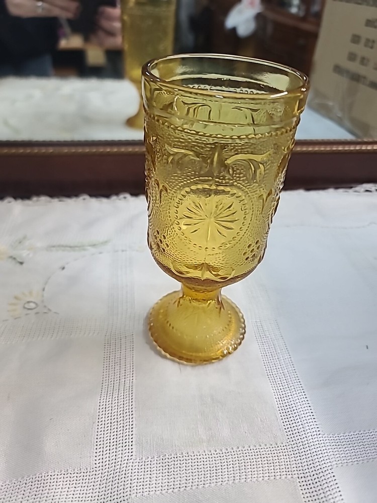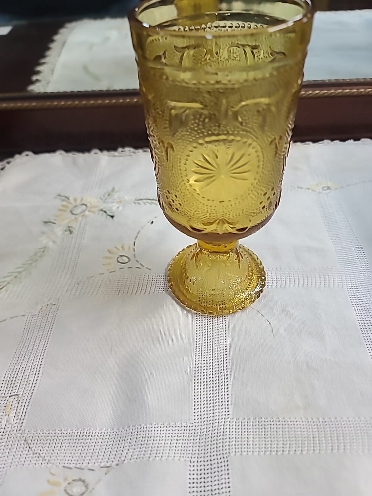 This set of five vintage Tiara Concord Daisy Footed Wine Goblets in a yellow amber color is a charming addition to any Mid-Century Modern collection. Made of pressed glass with a glossy finish, these round goblets stand 6 inches tall and feature a decorative daisy pattern. Produced in the United States during the 1960s by Brockway, these goblets are perfect for all occasions, including fall and Thanksgiving celebrations. The amber hue and elegant design make them ideal for serving drinks in style.