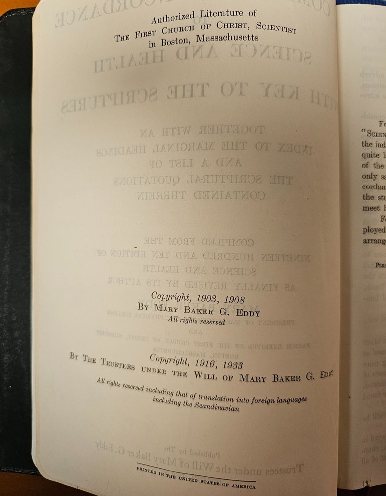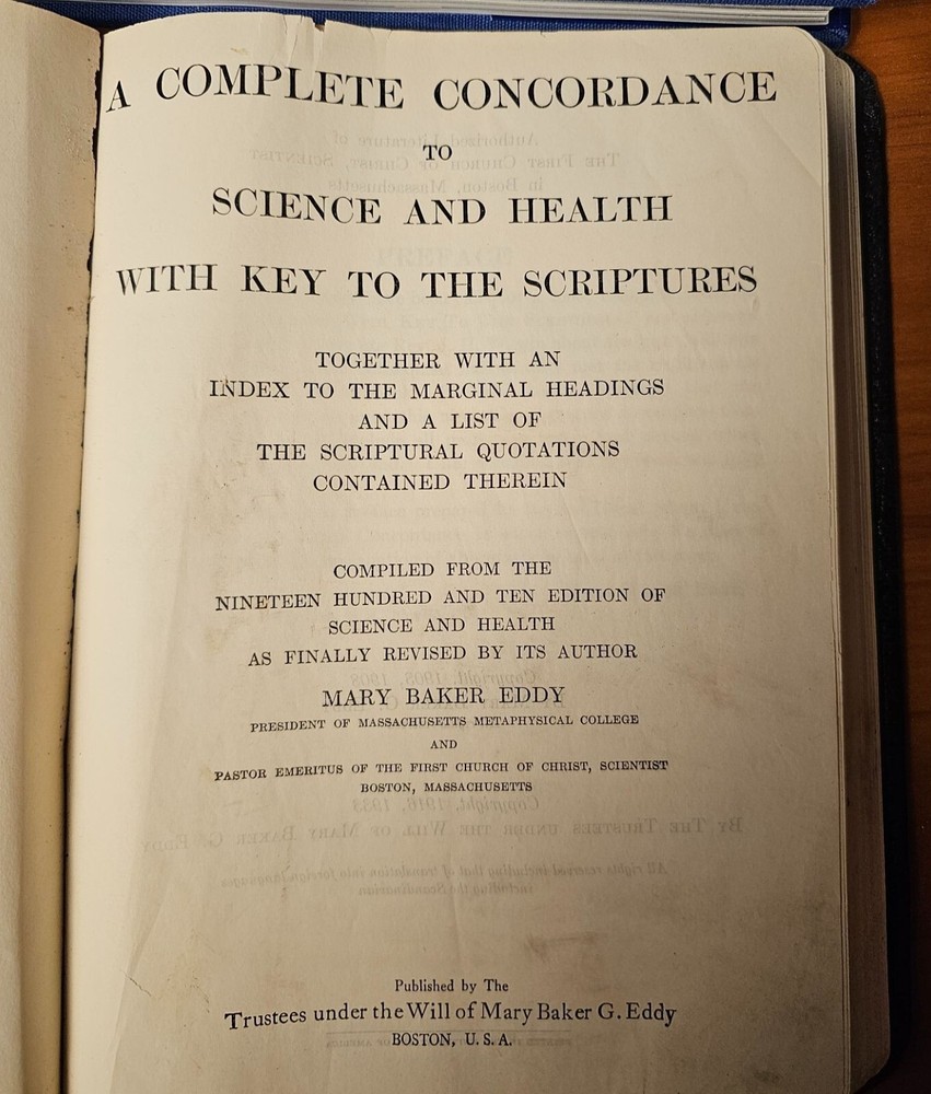 A valuable reference book for followers of Christian Science, featuring a complete concordance and scriptural insights by Mary Baker Eddy. • Hardcover with embossed gold seal • Includes ribbon bookmarks • Published under Mary Baker Eddy’s will • Authorized by the First Church of Christ, Scientist • Compiled from 1903 and revised editions Minor wear on spine and edges. Top to bottom = 9 inches. Side to side = 7 inches. Condition: Pre-Owned Good Mary Baker Eddy, scriptural study, leather-bound book, black hardcover, spiritual text, Bible study aid, Christian literature, embossed gold seal, collectible book, ribbon bookmarks, church reference, Christian Science book, religious concordance, vintage reference book