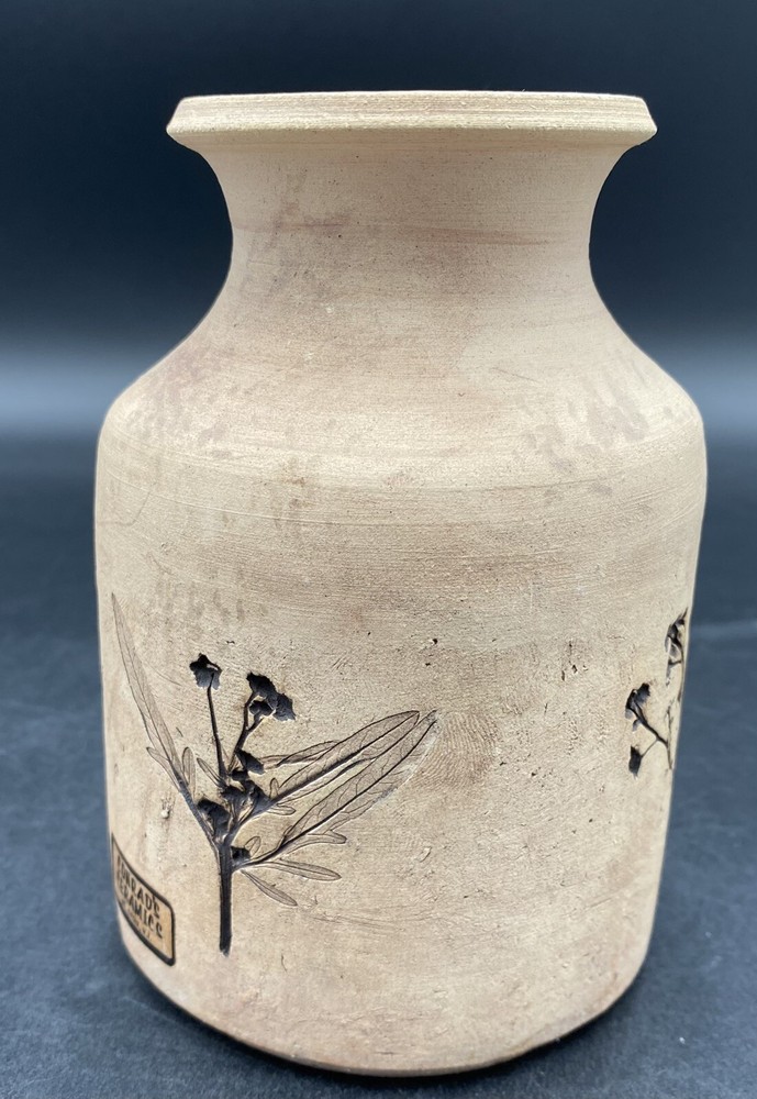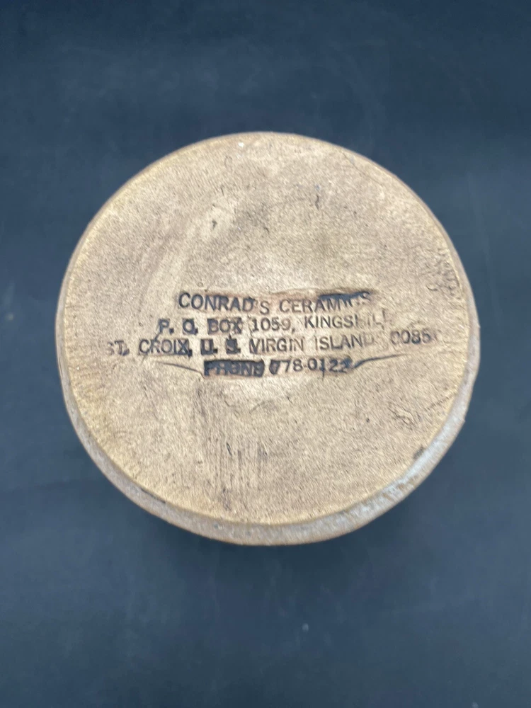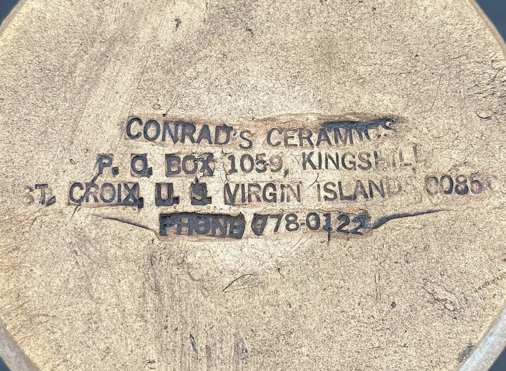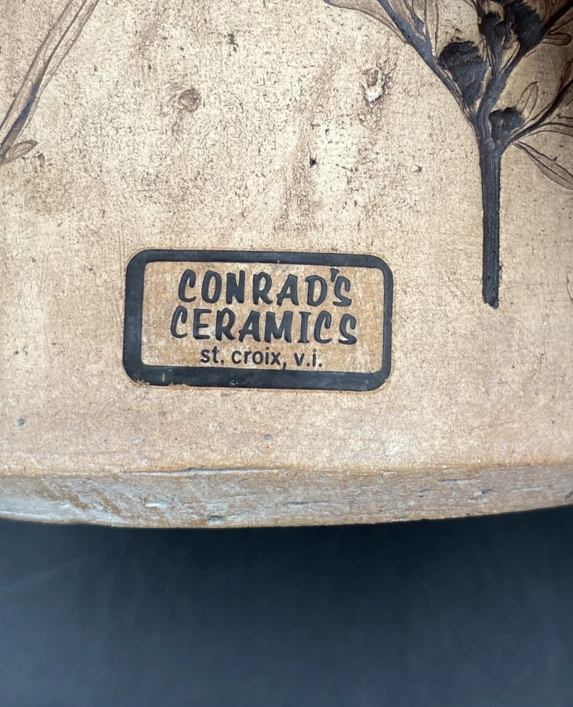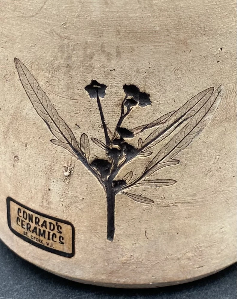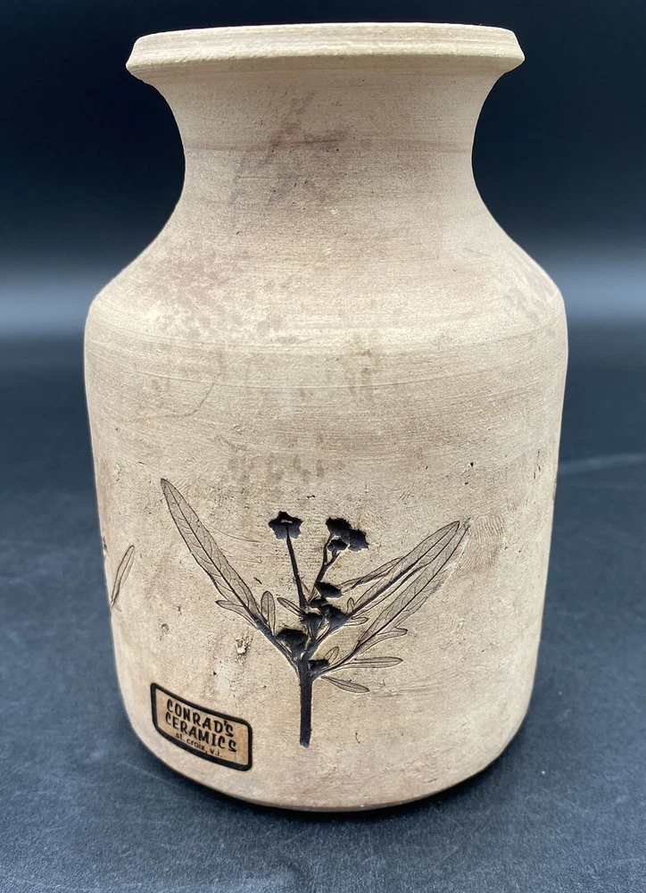 This vintage vase (1970s) from St. Croix, U.S. Virgin Islands artist Conrad Knowles is a unique piece of art pottery. It features impressed floral patterns from local St. Croix flowers and uses local clay. The detail of the flower prints is exquisite. The vase has a height of 5.5 inches and a width of 3.75 inches, weighing 1 pound and 1.5 ounces. It has a matte light brown exterior with the flower imprints highlighted in black, and a glazed white majolica inside, preparing the vase to hold water. The vase has a natural feel and presentation. It is perfect for decorative purposes as well as being a functioning vase. The vase is in very good used condition. There is one chip on the underside of the rim, but otherwise has no cracks or additional chips. There are no signs of wear. There is an original sticker attached to the vase, a maker's mark impressed on the lower rim, and Mr. Knowles' design shop impressed on the underside. There is an old flyer from Conrad's Ceramics included with the vase. It has a map on one side and a biography of Mr. Knowles on the other side.