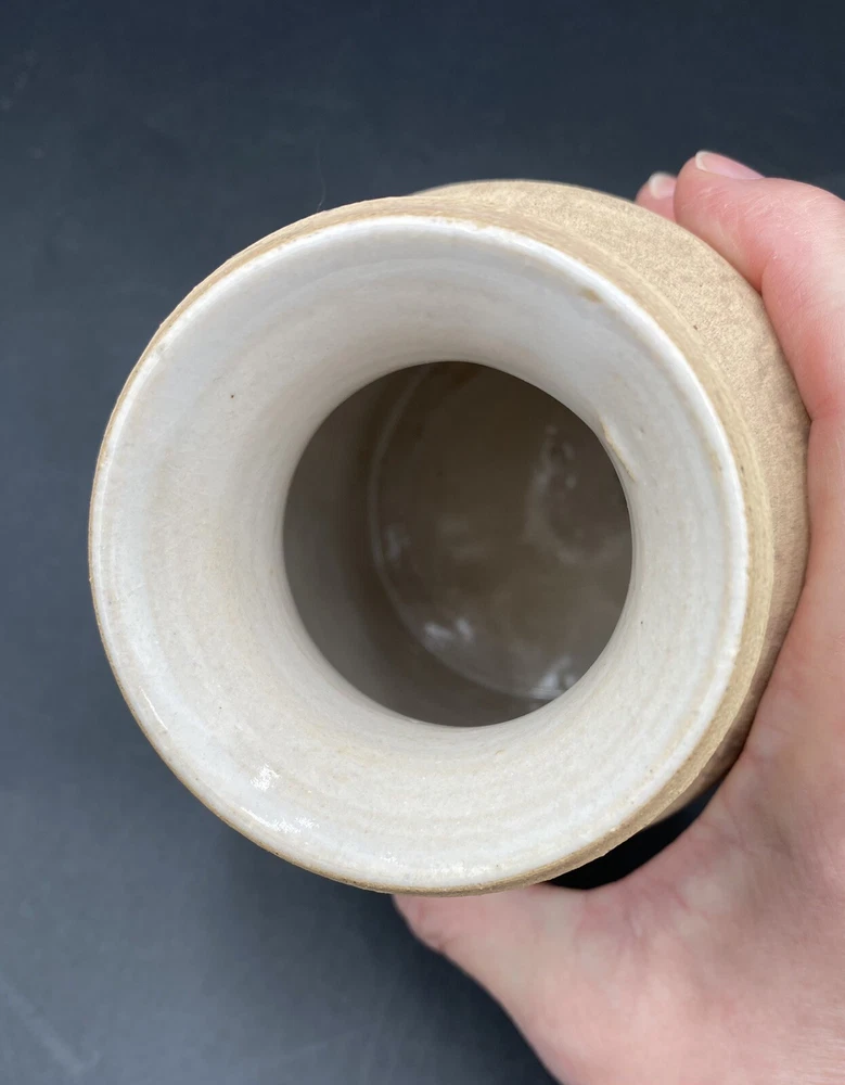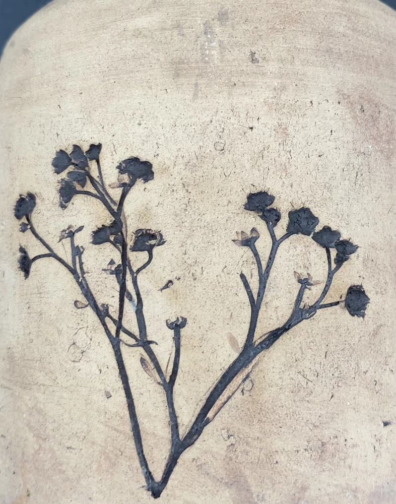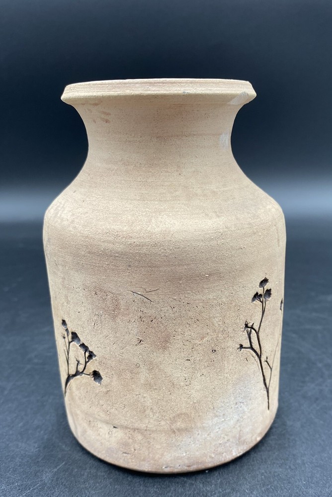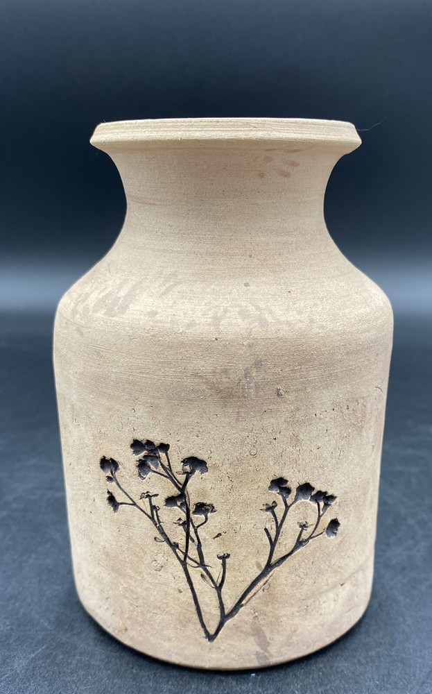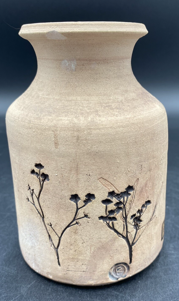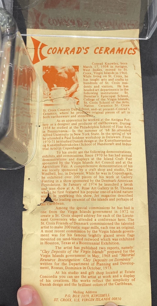 This vintage vase (1970s) from St. Croix, U.S. Virgin Islands artist Conrad Knowles is a unique piece of art pottery. It features impressed floral patterns from local St. Croix flowers and uses local clay. The detail of the flower prints is exquisite. The vase has a height of 5.5 inches and a width of 3.75 inches, weighing 1 pound and 1.5 ounces. It has a matte light brown exterior with the flower imprints highlighted in black, and a glazed white majolica inside, preparing the vase to hold water. The vase has a natural feel and presentation. It is perfect for decorative purposes as well as being a functioning vase. The vase is in very good used condition. There is one chip on the underside of the rim, but otherwise has no cracks or additional chips. There are no signs of wear. There is an original sticker attached to the vase, a maker's mark impressed on the lower rim, and Mr. Knowles' design shop impressed on the underside. There is an old flyer from Conrad's Ceramics included with the vase. It has a map on one side and a biography of Mr. Knowles on the other side.