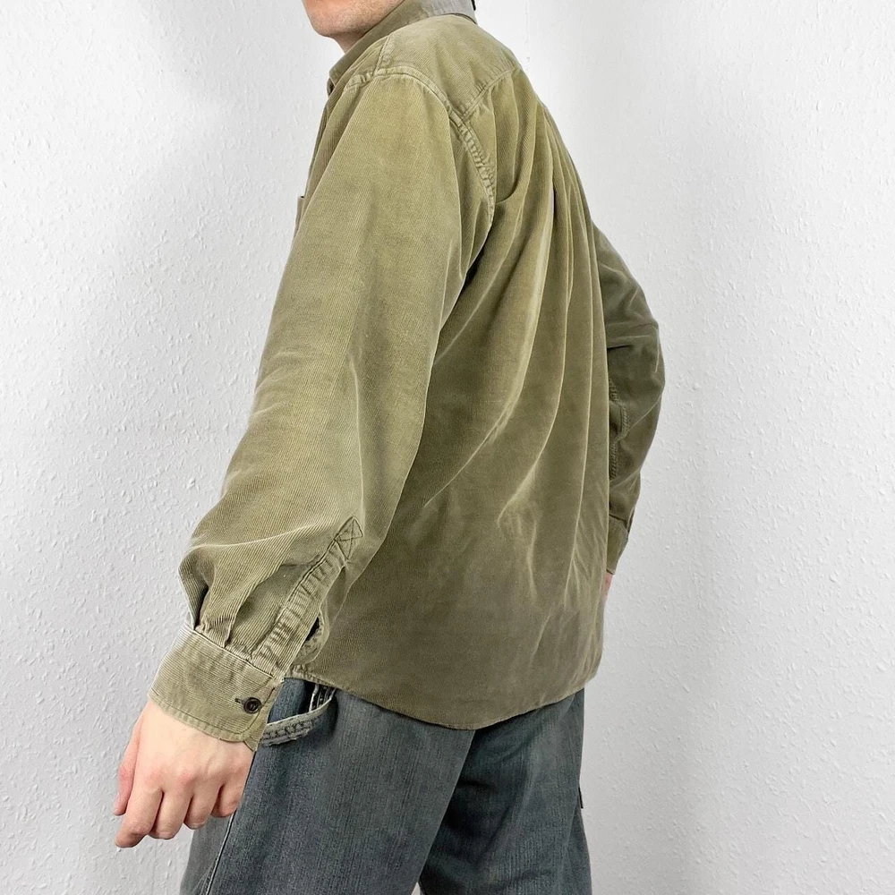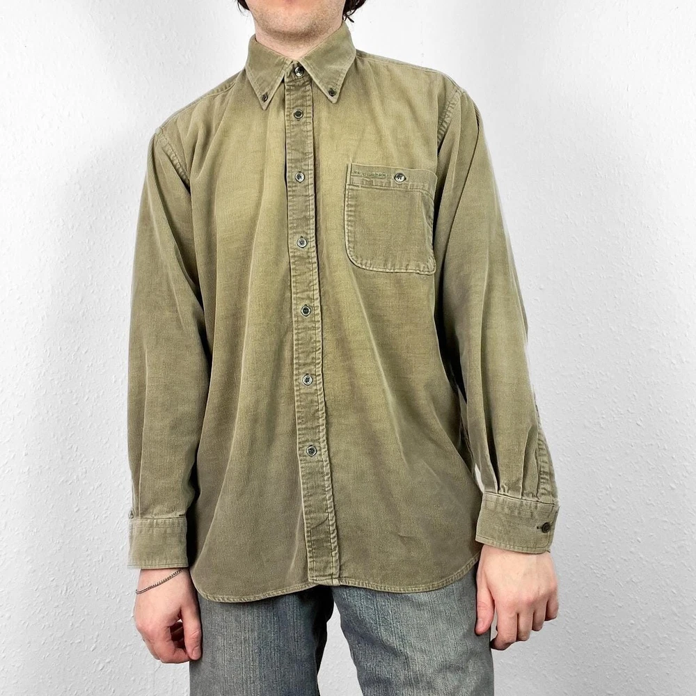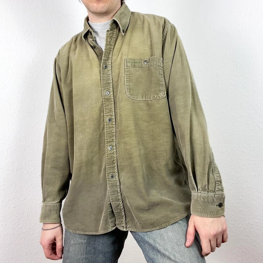 Vintage corduroy shirt in a khaki green colour. Brand is Lee Cooper. Cotton button up, has long sleeves & single chest pocket. Fading to colour throughout giving a work look - otherwise good condition. Labelled size large or suits smaller oversized, measurements below Length: 30.5 inches Pit to pit: 24 inches £3 UK P&P 💌 Model is 5’9 and a men’s medium Please get in touch for more measurements All items are second-hand so please expect small signs of wear - any major flaws will be noted
