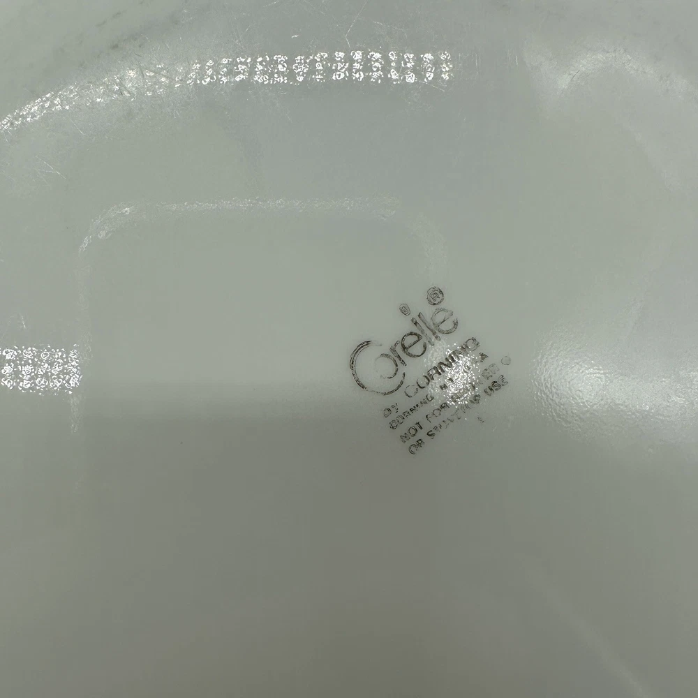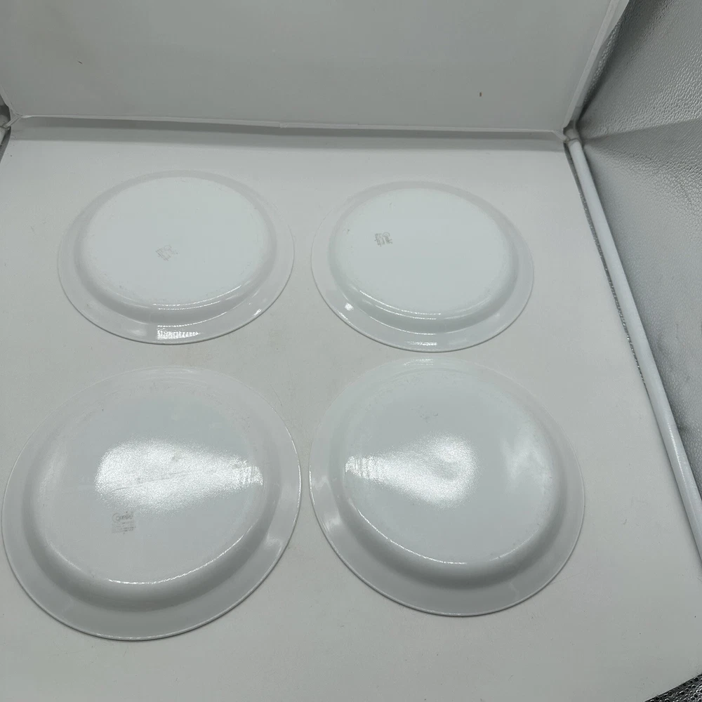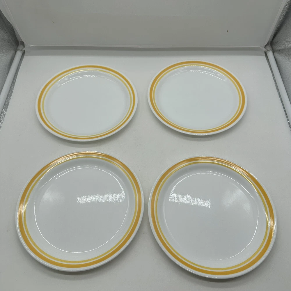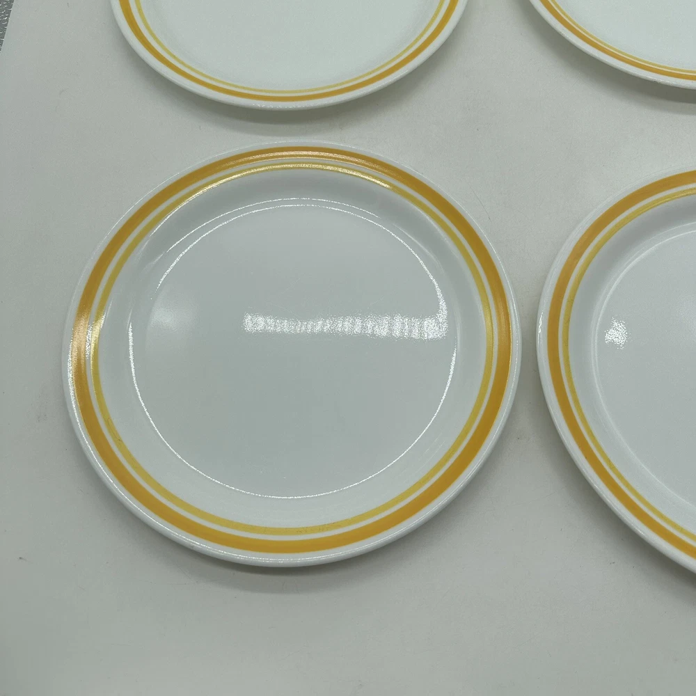 Vintage Corelle Citrus Yellow Flat Rimmed Soup/Pasta Bowl- 8 5/8". Also included is 4 salad plates that measures at 8 1/4 inches in diameter This set in a vibrant yellow color features a vintage milk glass production style by Corelle. The bowl and plates have a round shape with a glossy finish and a printed backstamp. They are perfect for all occasions and originate from America. Made of glass, these original soup bowls from the Citrus product line are a charming addition to any table setting.