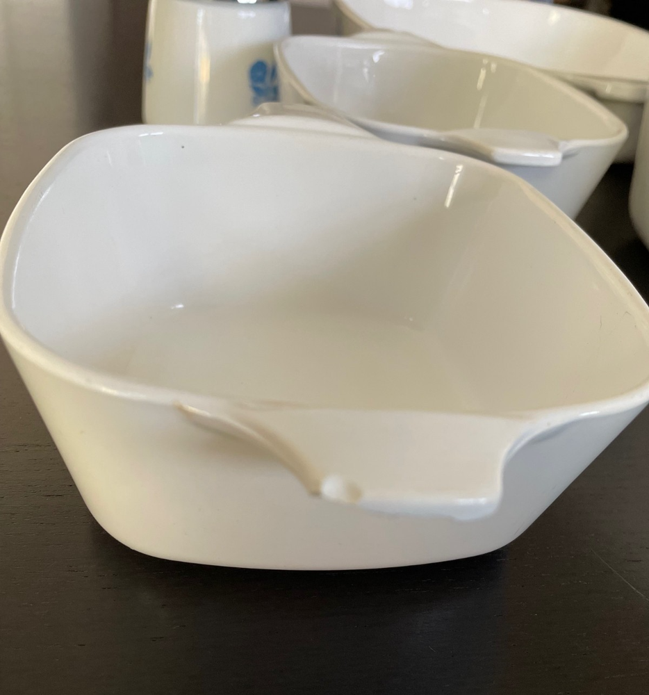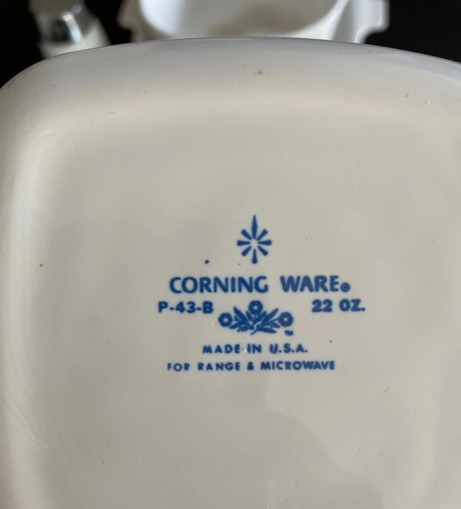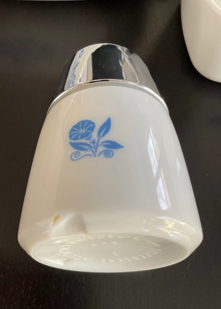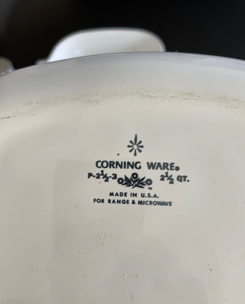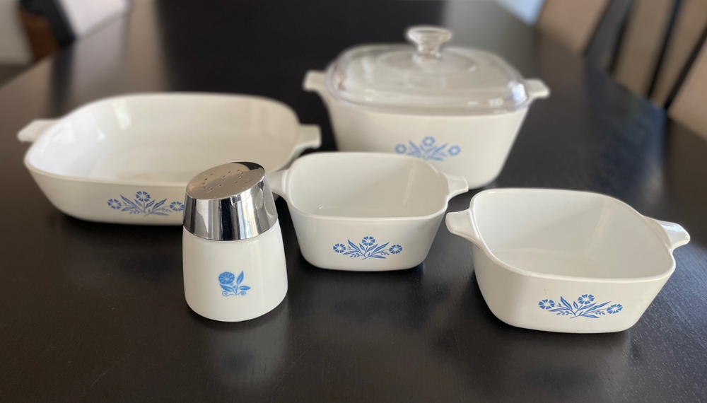 This is a beautiful 5-piece starter set of vintage Corning Ware in the classic Blue Cornflower pattern. Made in the USA. These are the original Pyroceram pieces, safe for range, oven, and microwave. This is a great starter set or replacement bundle for collectors and everyday use. The Blue Cornflower pattern remains one of the most recognizable and sought-after vintage kitchen designs. Set Includes: 1 - 10" Skillet/Baking Dish (P-10-B) 1 - 2.5 Qt Casserole Dish (P-2 1/2-B) with Glass Lid 2 - 22 oz Individual Casserole Dishes (P-43-B) 1 - Matching Santa Barbara Dispenser/Shaker Ships securely and with care and with plenty of bubble wrap. Feel free to reach out with any questions.