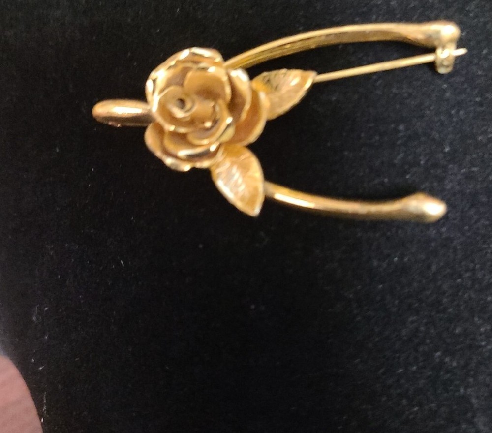 Add a touch of vintage sophistication to your outfit with this beautiful Coro goldtone brooch. The lucky wishbone rose design makes it perfect for special occasions like Christmas, anniversaries, and birthdays. The brooch is signed and features a stunning pink main stone color that complements the gold base metal. This vintage piece is an absolute must-have for any collector and will make an excellent addition to your jewelry collection. Bid with confidence and make this Coro brooch yours today!