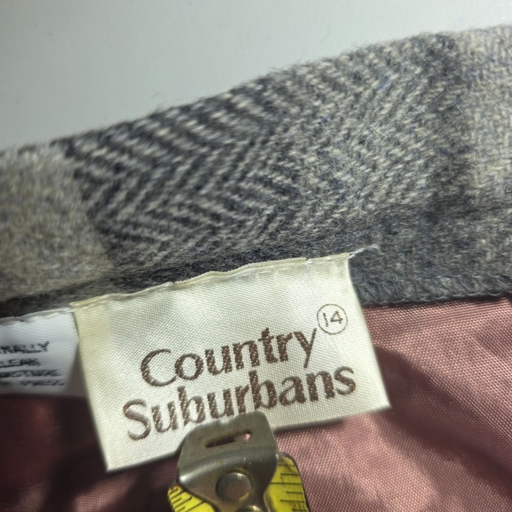 This plaid wool skirt by Country Suburbans combines classic style with durability. Ideal for professional or casual wear, offering comfort and elegance. • 100% pure wool material • Hidden side zipper with clasp • Fully lined with a satin interior • Professional dry clean recommended • Mid-length design Waist = 15 inches across
