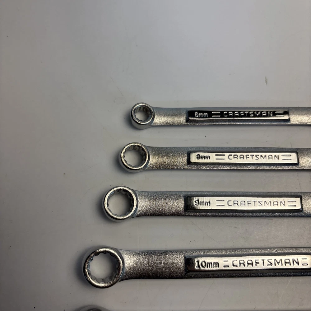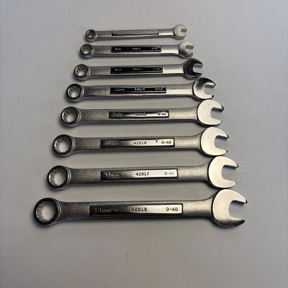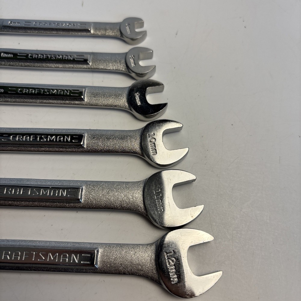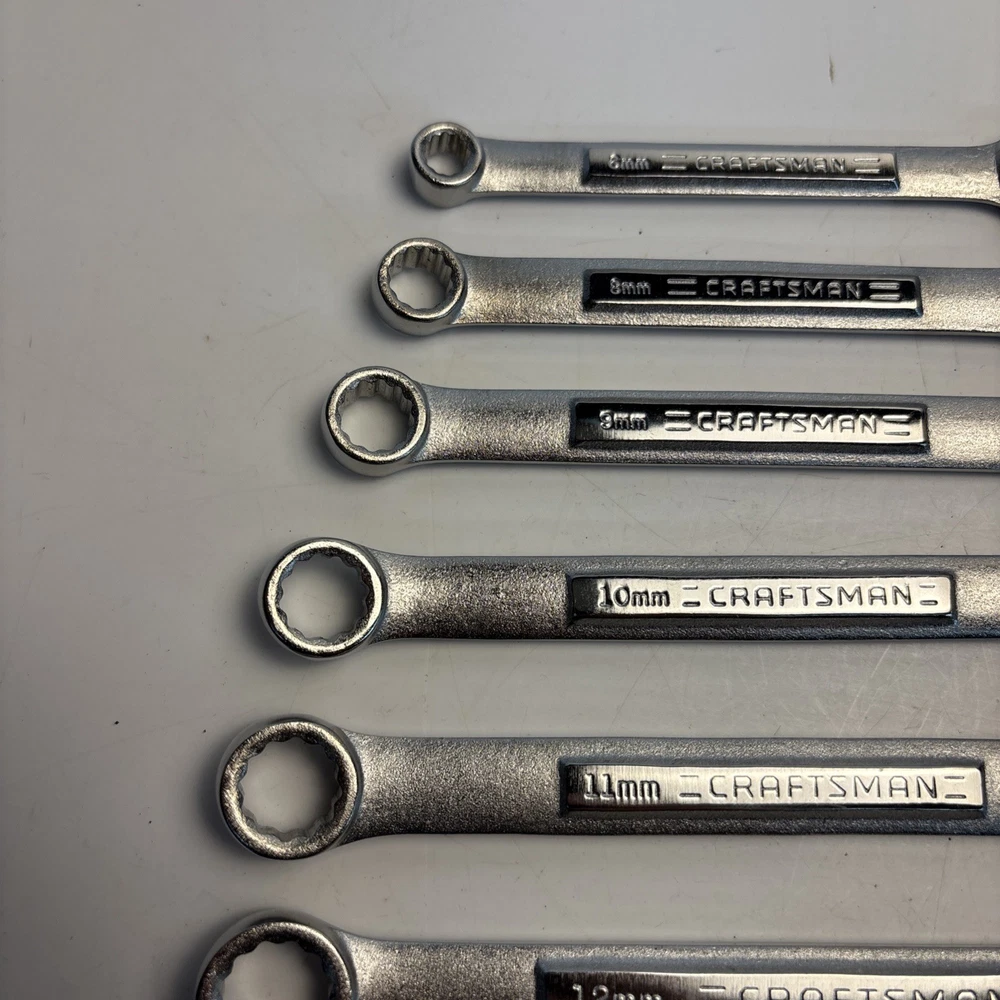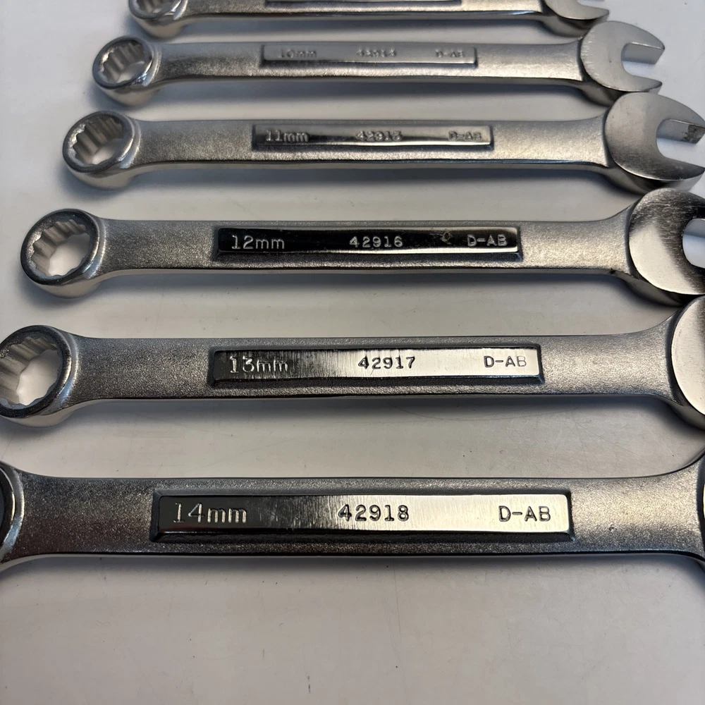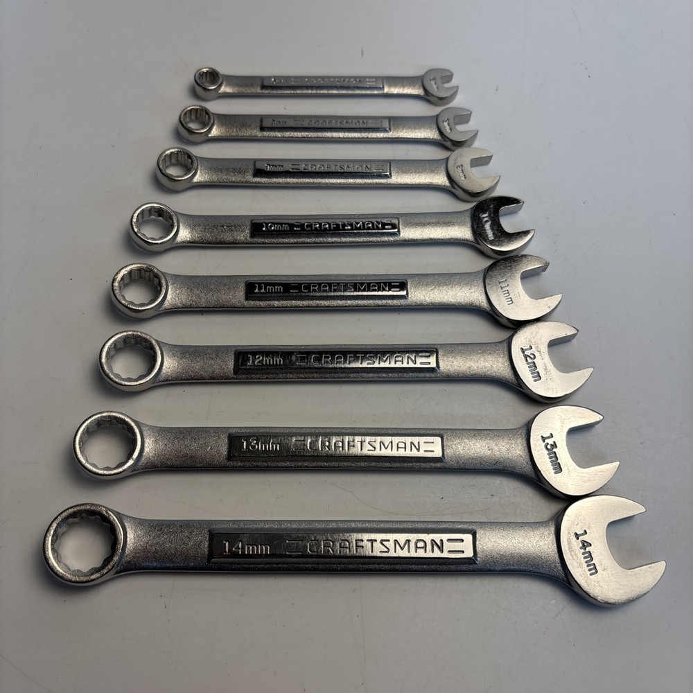 Vintage Craftsman metric combination wrench set. Includes sizes ranging from 6mm through 14mm. No 7mm. Wrenches are marked with “D-AB” manufacturer/date code and feature the standard Craftsman raised panel design. Condition: New old stock. Unused with light storage wear. Packaging shows age, creasing, and wear from storage. Packaging was sealed prior to photos See photos for complete details.