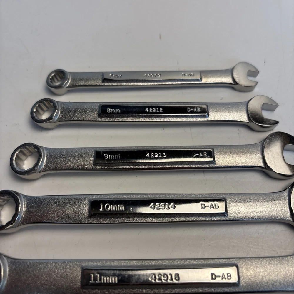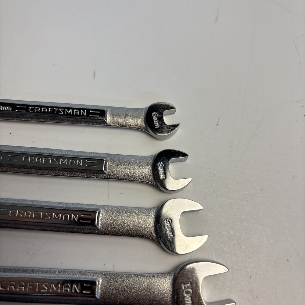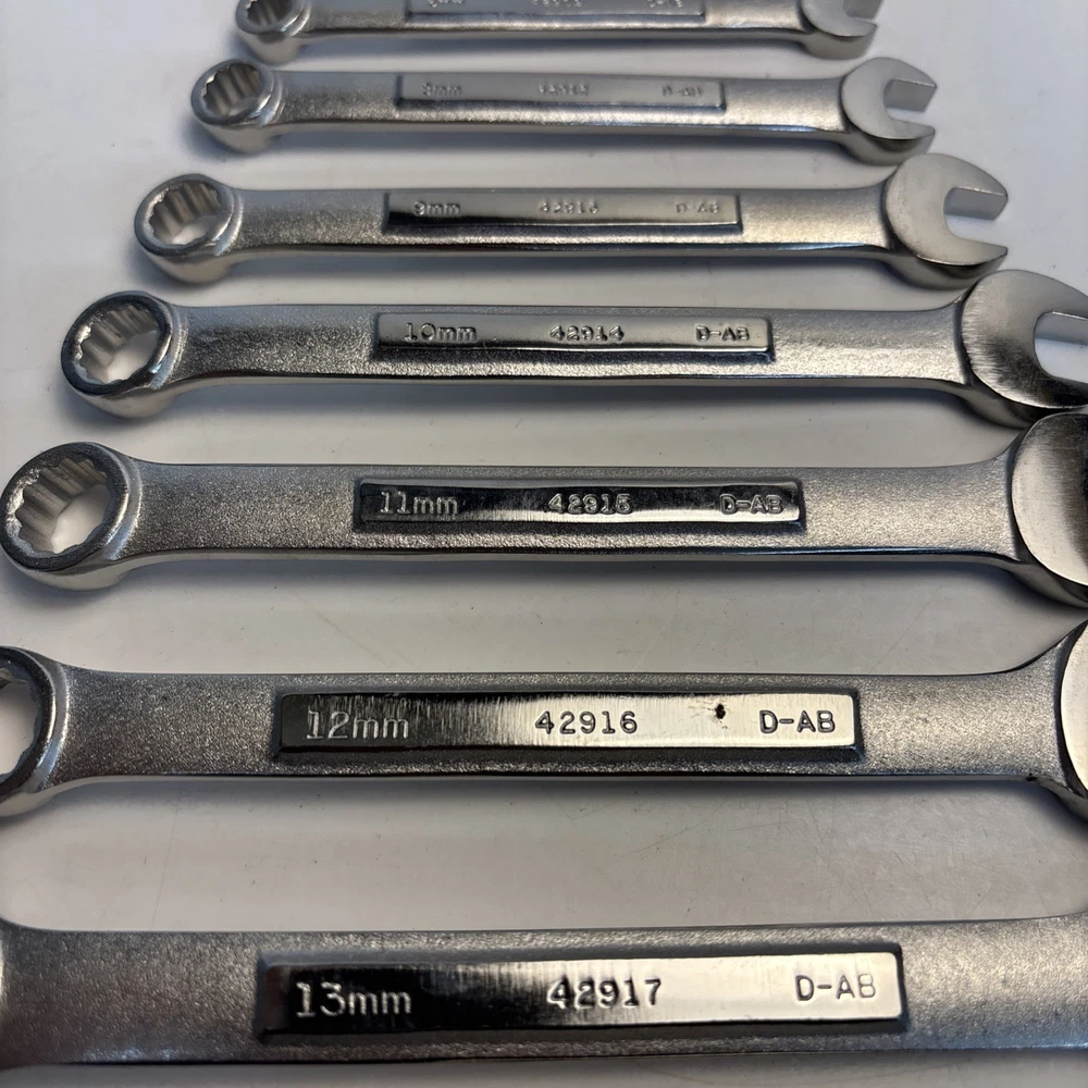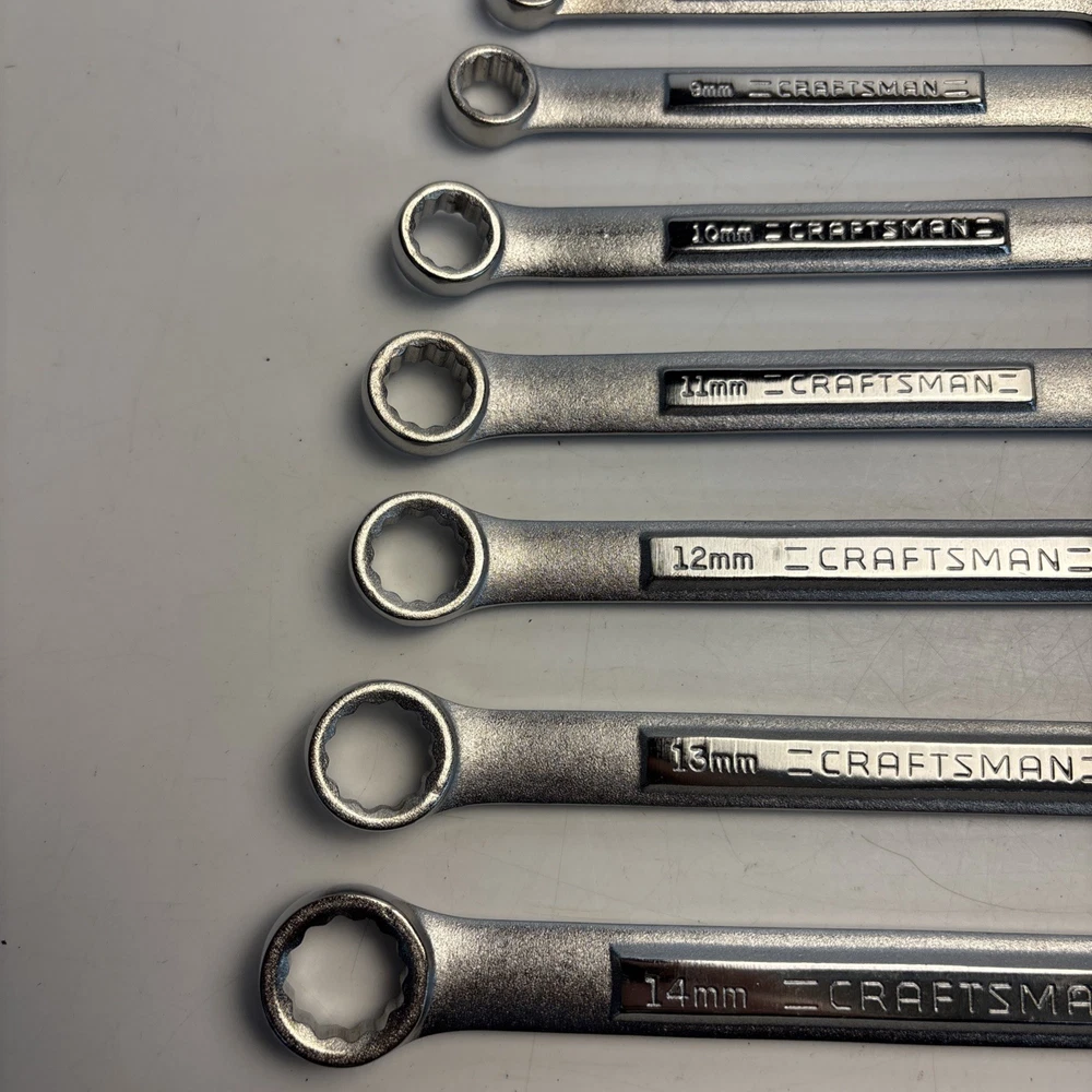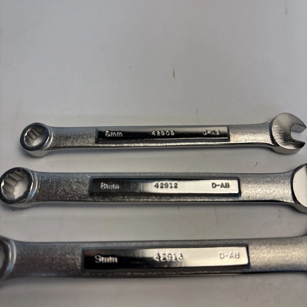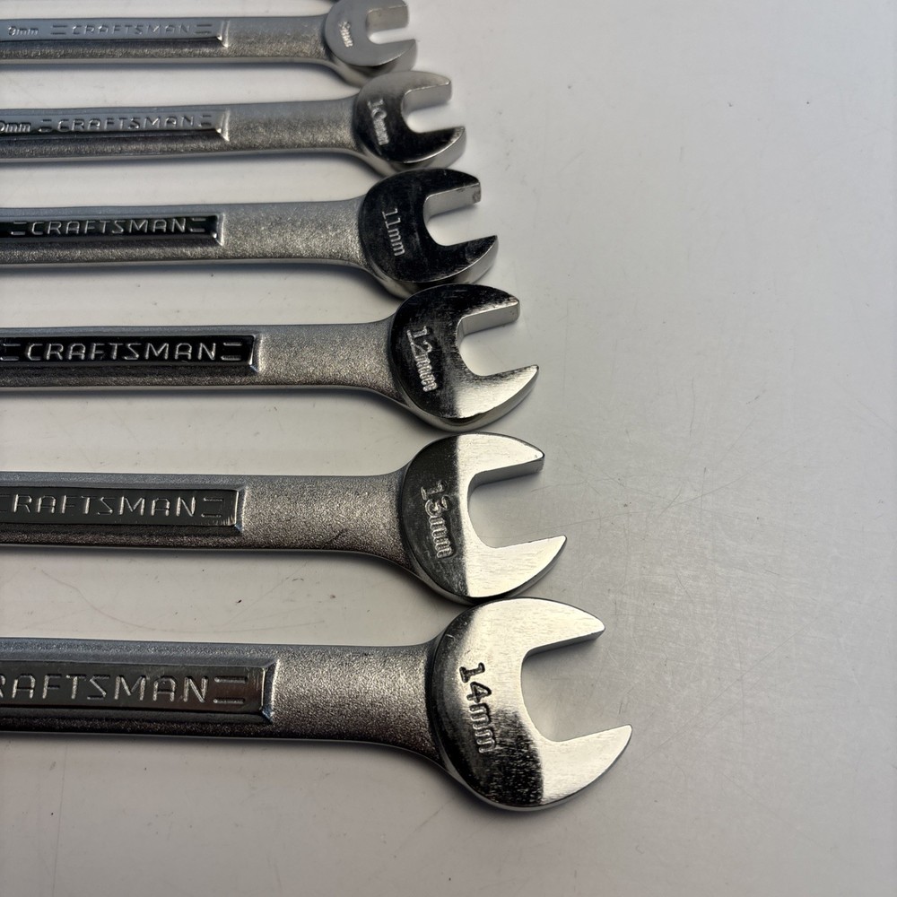Vintage Craftsman metric combination wrench set. Includes sizes ranging from 6mm through 14mm. No 7mm. Wrenches are marked with “D-AB” manufacturer/date code and feature the standard Craftsman raised panel design. Condition: New old stock. Unused with light storage wear. Packaging shows age, creasing, and wear from storage. Packaging was sealed prior to photos See photos for complete details.