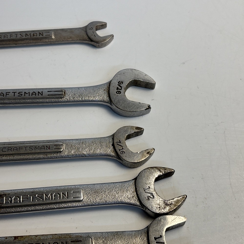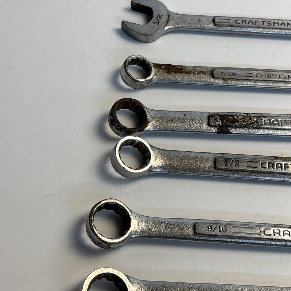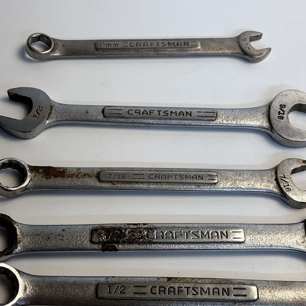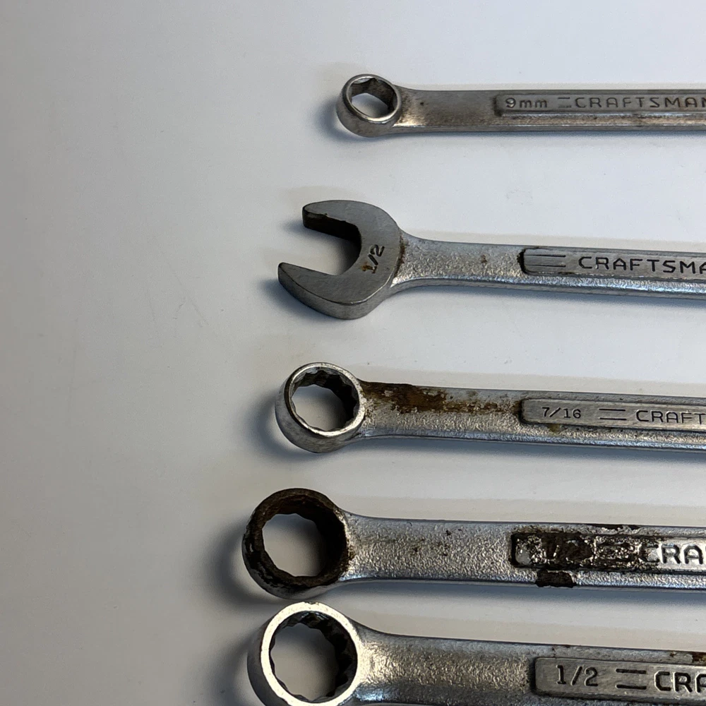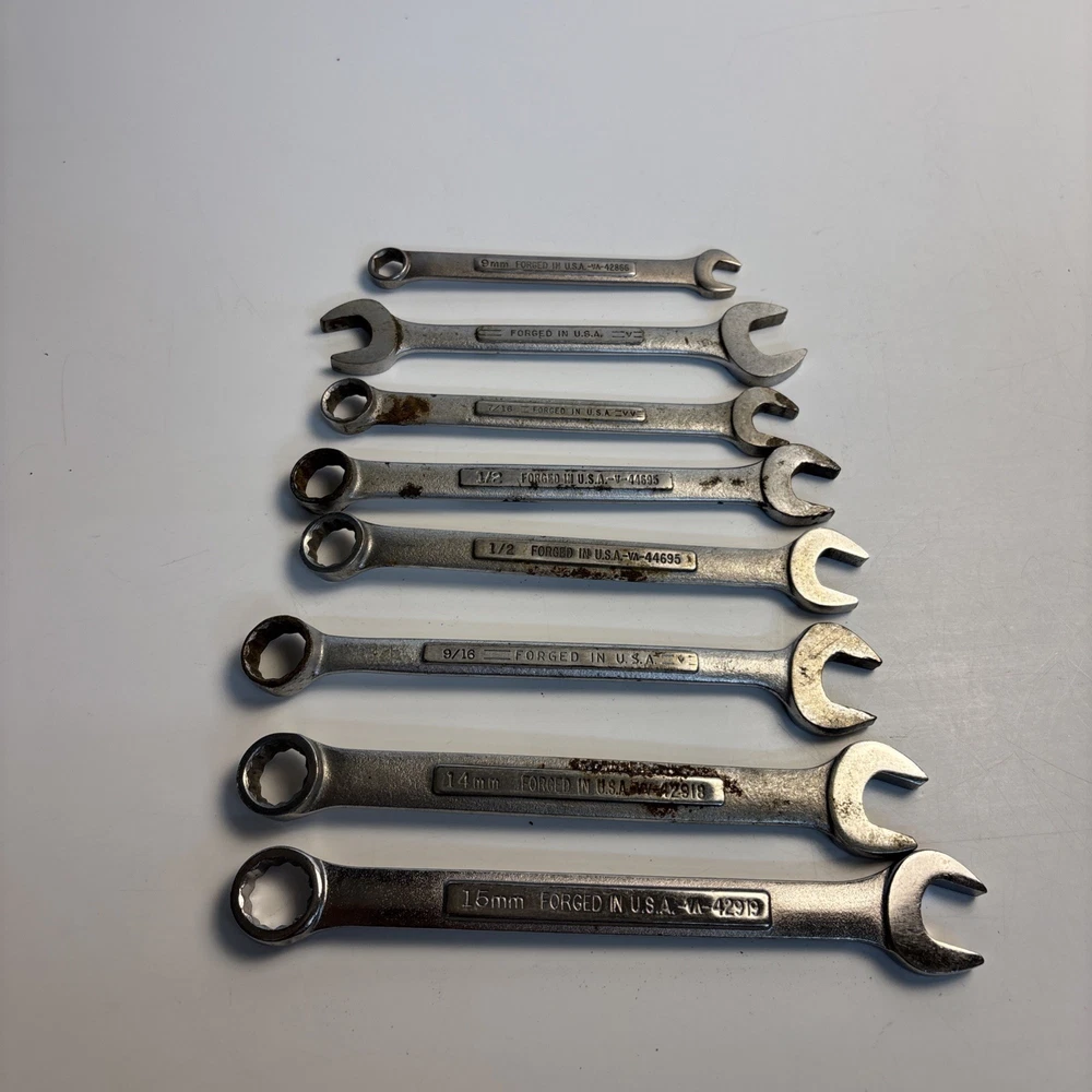 Lot of 8 vintage Craftsman wrenches made in the USA. Includes a mix of SAE and metric combination and open end wrenches. Sizes included: • 15mm combination • 14mm combination • 9mm combination • 9/16” combination • 1/2” combination (2) • 7/16” combination • 1/2” x 9/16” double open end wrench Condition: Shows typical vintage wear including surface rust, discoloration, and use marks. Some heavier rust on a few pieces. No visible cracks or major damage. See photos for complete details.