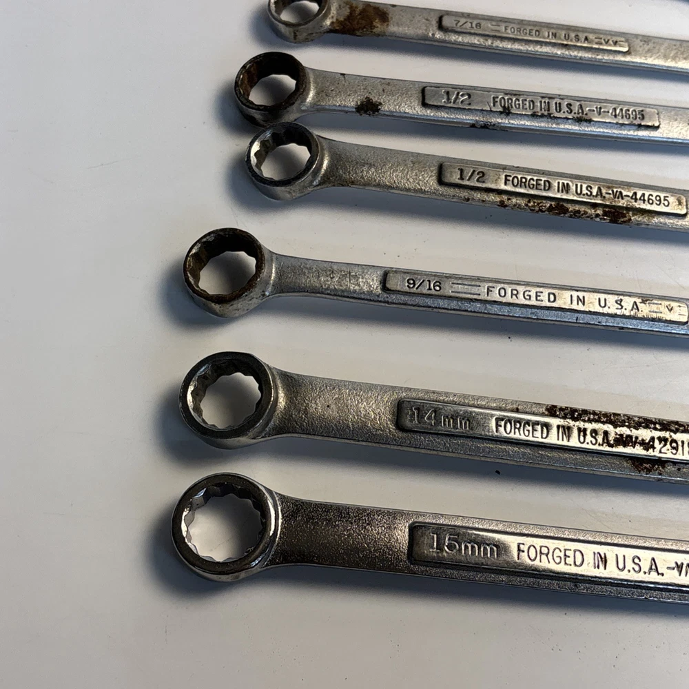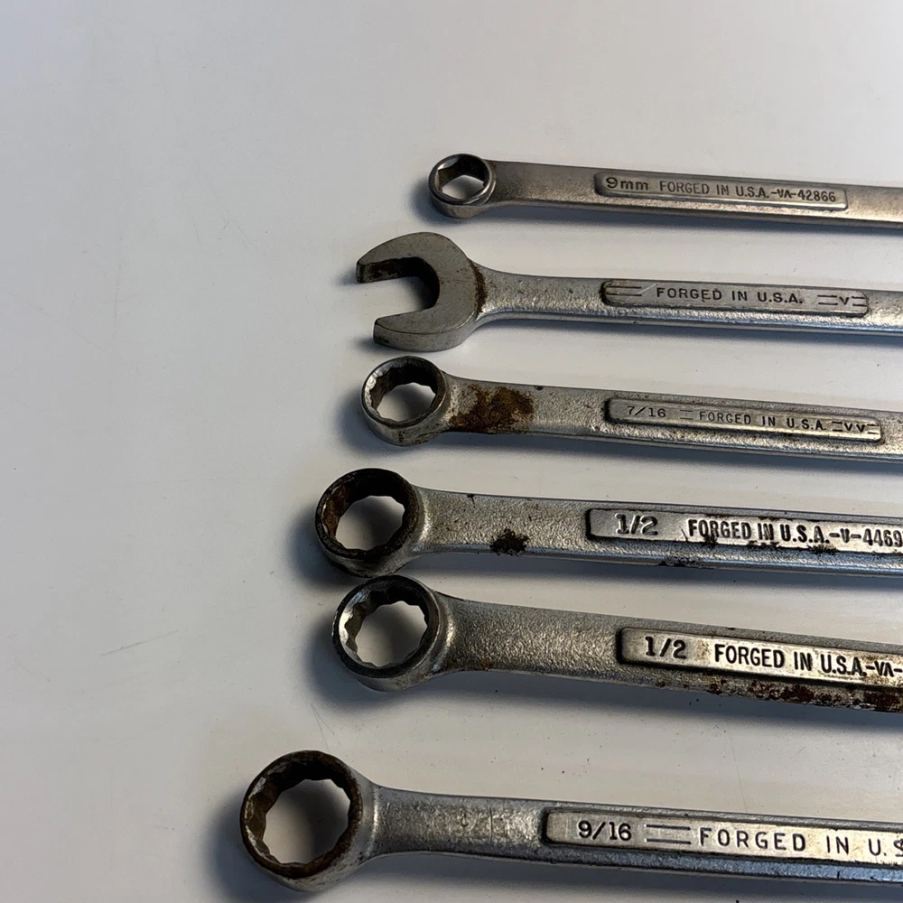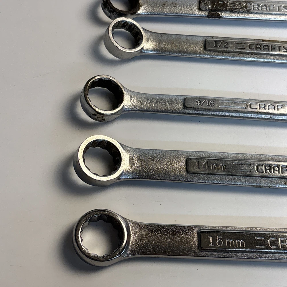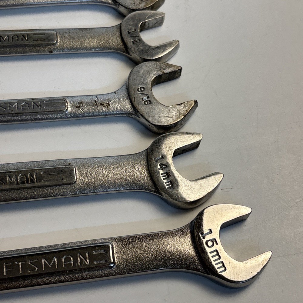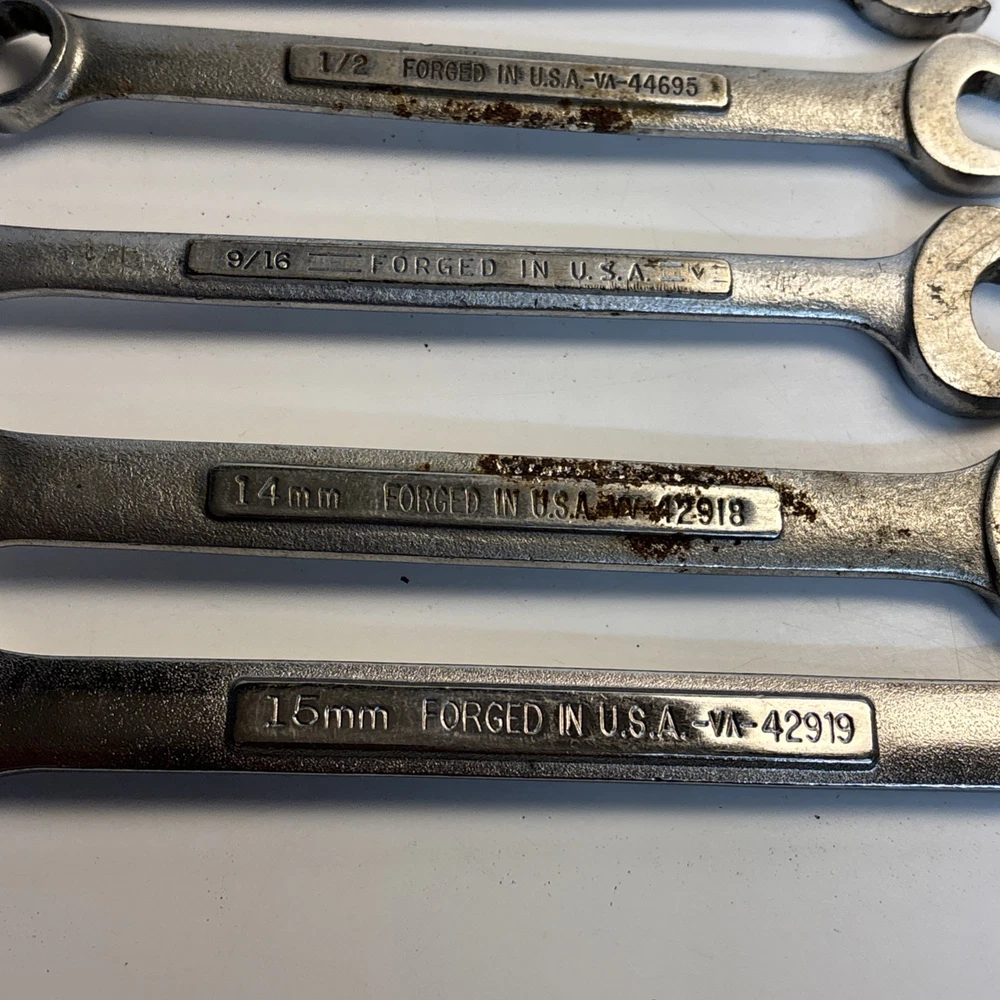 Lot of 8 vintage Craftsman wrenches made in the USA. Includes a mix of SAE and metric combination and open end wrenches. Sizes included: • 15mm combination • 14mm combination • 9mm combination • 9/16” combination • 1/2” combination (2) • 7/16” combination • 1/2” x 9/16” double open end wrench Condition: Shows typical vintage wear including surface rust, discoloration, and use marks. Some heavier rust on a few pieces. No visible cracks or major damage. See photos for complete details.
